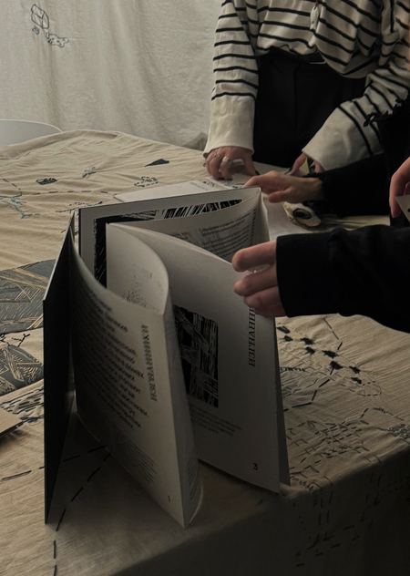 Для фестиваля наша группа подготовила оформление экседры на втором этаже выставочного пространства, в которой были представлены итоги личных размышлений. Концептуально она освобождена от всех лишних элементов и приглашает к вдумчивому осмыслению территории, представляя из себя лаконично оформленный натуральной тканью стол с зинами по индивидуальным темам исследований. Каждому зину соответствует свой стул, образно концентрирующий в себе философию его автора. Экспозиция буквально «пронизана» стежками, изображающими отложившуюся в памяти ментальную карту района.