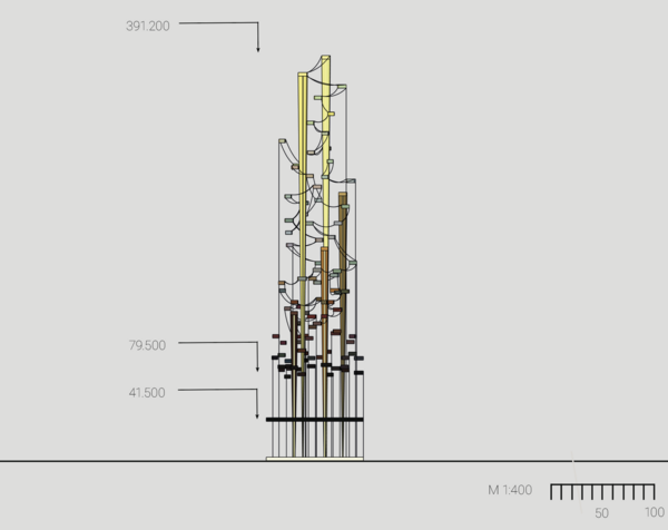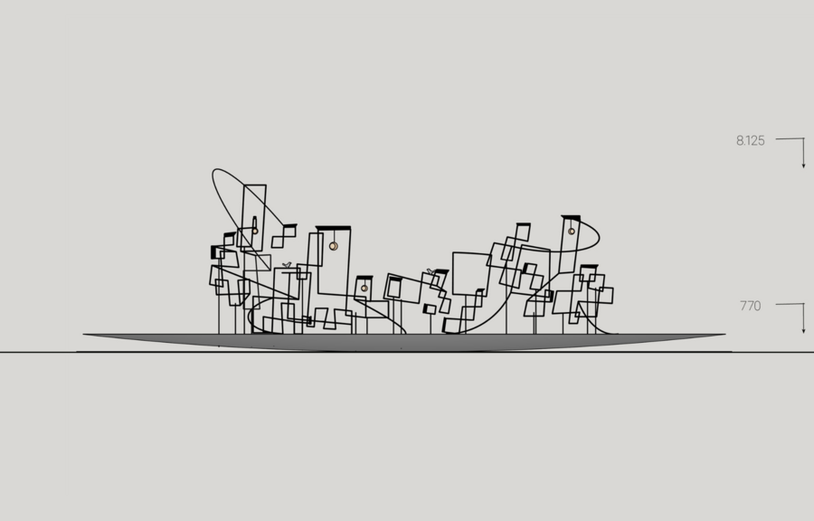 Архитектурная фантазия была сделана по принципу подъема более светлых (легких) кубов картины, чтобы представить, какой звук мог иметь в виду Клее, называя свою картину «Древняя гармония». Пауль Клее был талантливым музыкантом, звук играет большую роль в его творчестве.