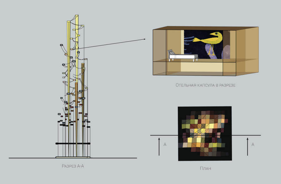 Назначение этого фантазийного архитектурного объекта — капсульный отель. Картины Клее всегда живо населены фантастическими существами, движением, они «обитаемы». «Обитаем» и этот объект.