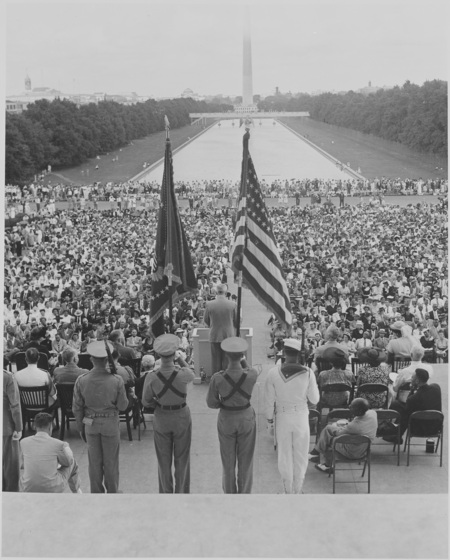 Гарри С. Трумэн выступает на 38-й ежегодной конференции на ступенях Мемориала Линкольна 29 июня 1947 года Элизабет Экфорд подвергается насмешкам при входе в школу после расовой интеграции в 1957 году