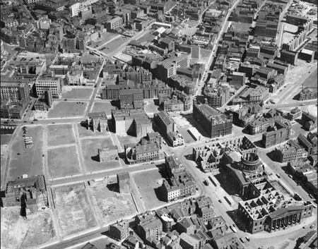 Здание таможни на Ганновер-стрит и прилегающий к нему район, пострадавший от бомб, Ливерпуль, 1946 год Мемориал Лютера и руины Фрауэнкирхе, Дрезден, 1945 год