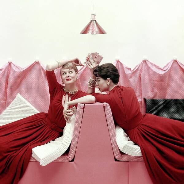 Модель в вечернем платье от Youth Guild, за ней мужчина в костюме. 1 декабря 1953 года Модели в красных платьях, фотография Ричарда Ратледжа, 1 июля 1954 года