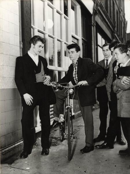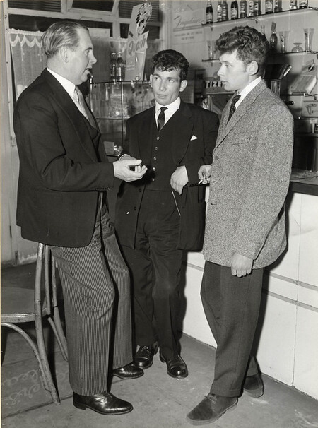 Лондон, фотография Пола Поппера, «тедди бойз» возле подростковой столовой «Элефант энд Касл», июль 1955 года Лондон, фотография Пола Поппера, мальчишник «тедди боев в танцевальном зале, июль 1955 года