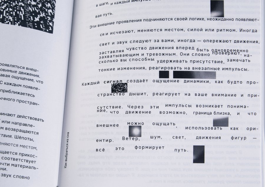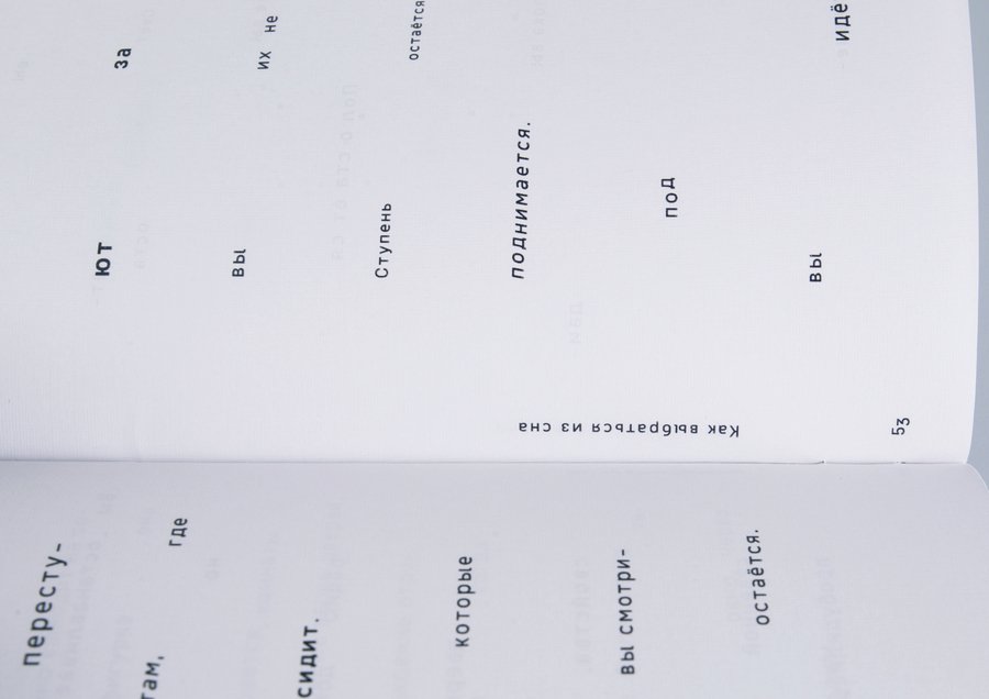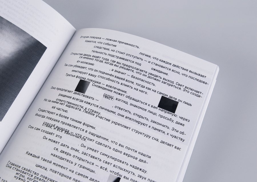 Верстка текста передает ощущение сна, сначала кажется нормальной, но к концу книги рассыпается окончательно. Текст основных частей сгенерирован ии, так как у сна и нейросети похожий принцип — они основываются на реальности, но создают что-то несуществующее, их главная задача — быть убедительными.