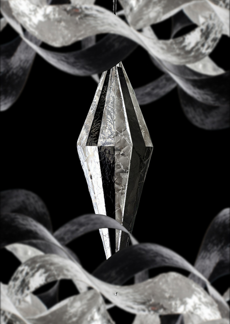 — Форма с неровными гранями и контрастом черного и серебра отражает напряжение и динамику движения — Свет и тень прожитого года преломляются на поверхности, напоминая о его переломных моментах и хрупком равновесии между хаосом и гармонией