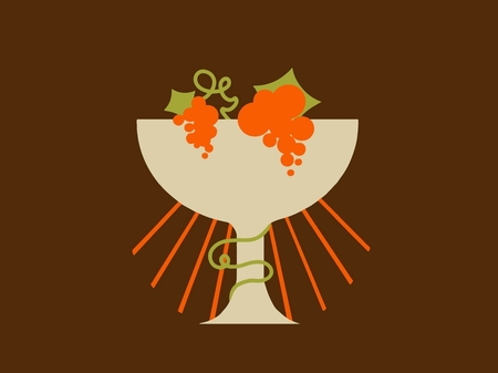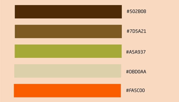 Create a minimalistic logo design featuring a stylized coffee-related graphic set against a stark white background. The central element is a green teacup-like shape with a long stem, resembling a wine glass. Atop the teacup, a cluster of orange, grape-like shapes is positioned, with a coffee bean at the center. Above this, gold-colored rays emanate, creating the visual of a sunrise. Below the main graphic, the word «SUNRISE» is written in a dark brown, sans-serif font. Adjacent to the logo, a color palette is displayed, showcasing shades of dark brown, gold, light green, cream, and orange, with each color accompanied by its hexadecimal code. The overall composition is clean and simple, with a focus on geometric shapes and bold colors. The style is flat, and the atmosphere is art-noveau, aiming to evoke a sense of morning freshness associated with coffee