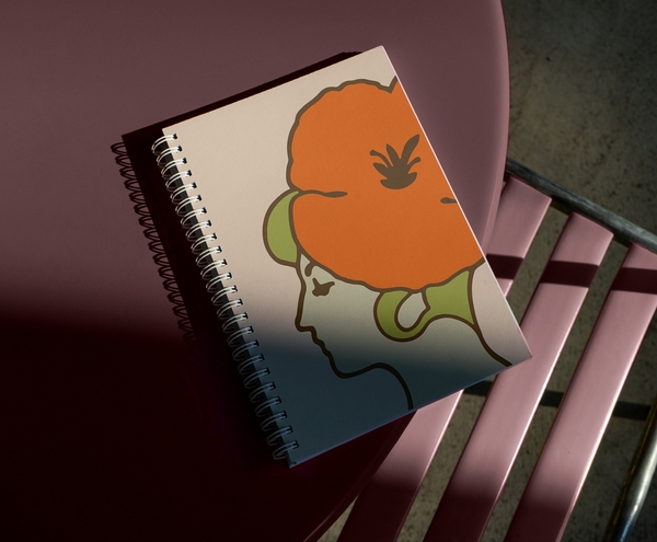 Create a cream-colored tote bag with a «SUNRISE» logo featuring a coffee bean, grapes, and sun rays design, placed alongside a small, brown leather notebook with a similar logo embossed on its cover. The items are positioned on a round, wooden table with a warm, reddish-brown hue. The background features a blurry cafe interior with wooden tables and chairs, a coffee counter, and a window with natural light subtly illuminating the scene. A cup of coffee with latte art is visible near the window. The composition is taken at eye-level, using soft, natural lighting, creating a warm and inviting atmosphere. The textures of the canvas bag, leather notebook, and wooden table are detailed, with a focus on depth of field. The style is clean, modern, and product-focused, suggesting a lifestyle or branding shot, with a shallow depth of field, emphasizing the foreground items. The color palette is warm, with shades of cream, brown, and natural wood tones, suggesting a cozy, inviting setting. The overall mood is calm and inviting, with a subtle emphasis on design and branding