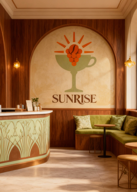 Create a beautifully lit interior of a coffee shop, showcasing a blend of art nouveau design elements and modern cafe aesthetics. The walls are paneled in warm, dark wood, complemented by arched detailing and decorative sconce lighting with gold-tinted shades that cast a soft glow. A large mural in the center features a stylized image of a coffee cup with a sunburst and the word «SUNRISE» written below in a vintage font. The curved bar has a white countertop and is decorated with an intricate green and bronze art nouveau pattern. Seating consists of a built-in green velvet bench with patterned pillows and small round wooden tables. Large arched windows offer a view of an outside street, lined with buildings and leafy trees, bathing the interior in natural light. The atmosphere is cozy, inviting, and nostalgic, with a touch of elegance, soft lighting, and warm color palettes. The composition is a medium shot, shot from a slightly low angle, emphasizing the details and space
