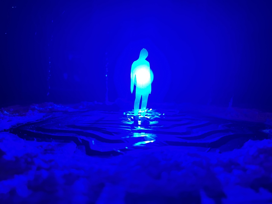 Это обрядовая, ритуальная история про обновление через тождество воды и света, про омовение, очищение тела и души, испытание духа. Инсталляция рассказывает о перерождении, о задержанном вдохе перед погружением, о застывшем мгновении трепета перед изменениями.
