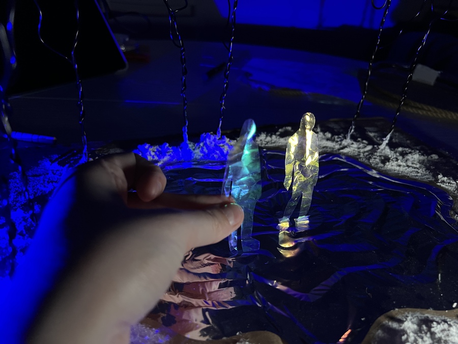 За основу визуала взят фигуративный образ — прорубь с купальщиками. Форма проруби — дышащие абстрактные линии, имитирующие круги, которые образуются, когда касаешься воды. Силуэты купальщиков, напоминающие людей или души, отражают свет бликами и переливами. Фигуры соотносятся с человеком по высоте, вовлекая зрителя в ритуальный процесс инсталляции.