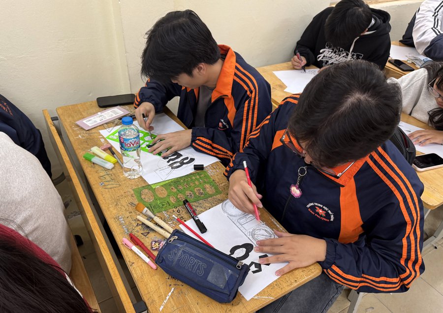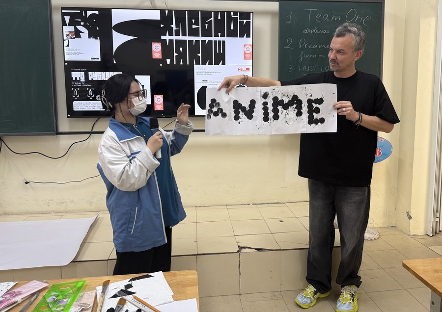 For the logo we try to find simple modules, because the typeface is a rhythm. I give pupils the stencils and we have to use only one simple shape from them