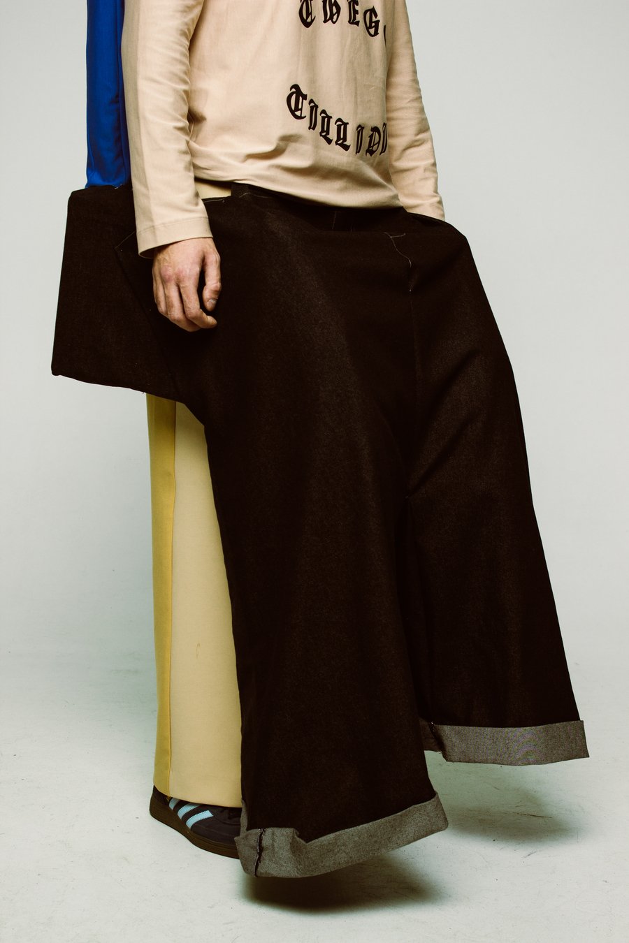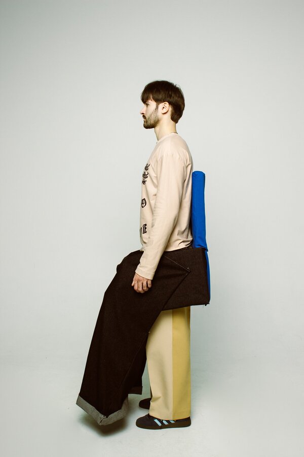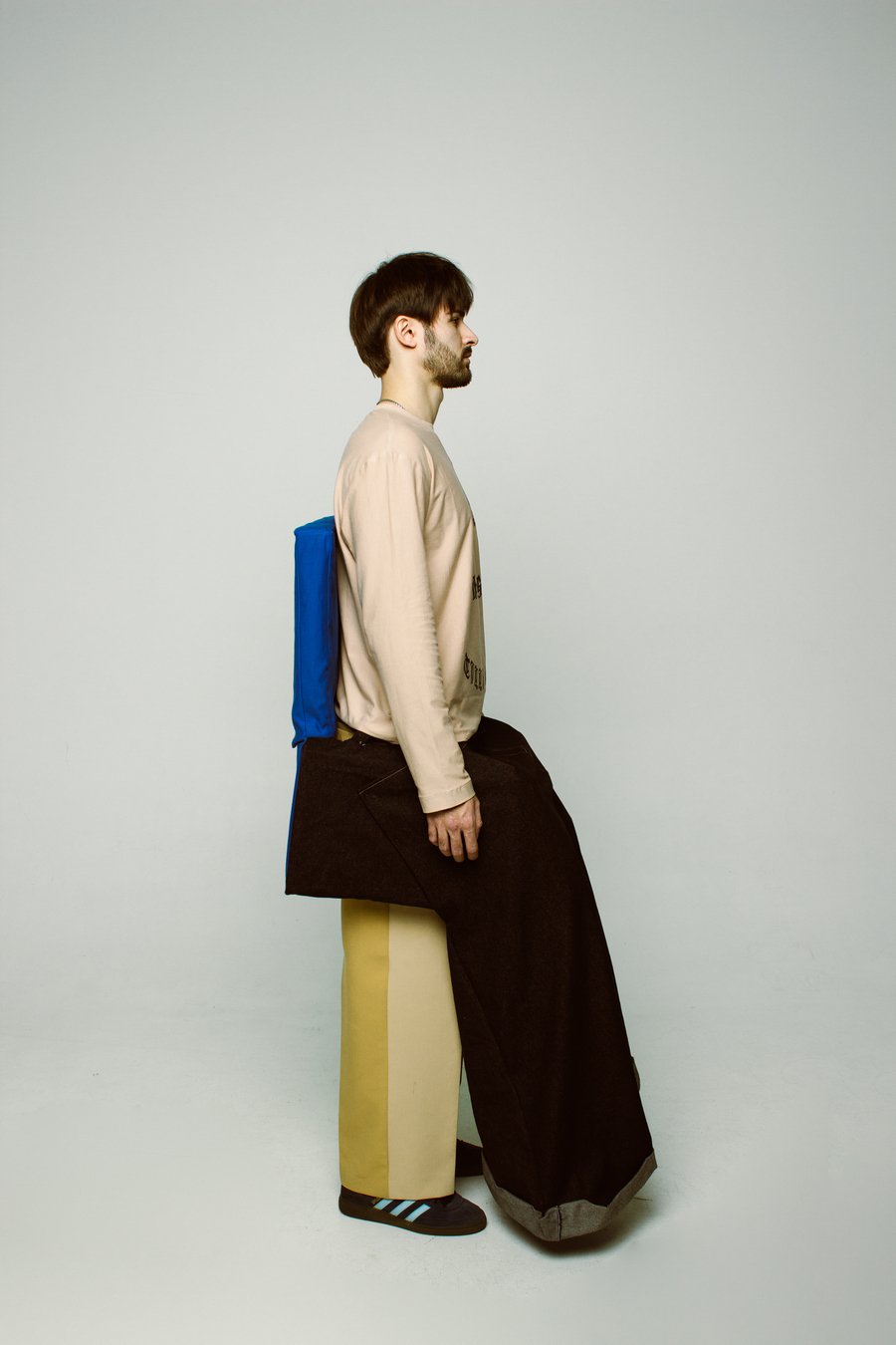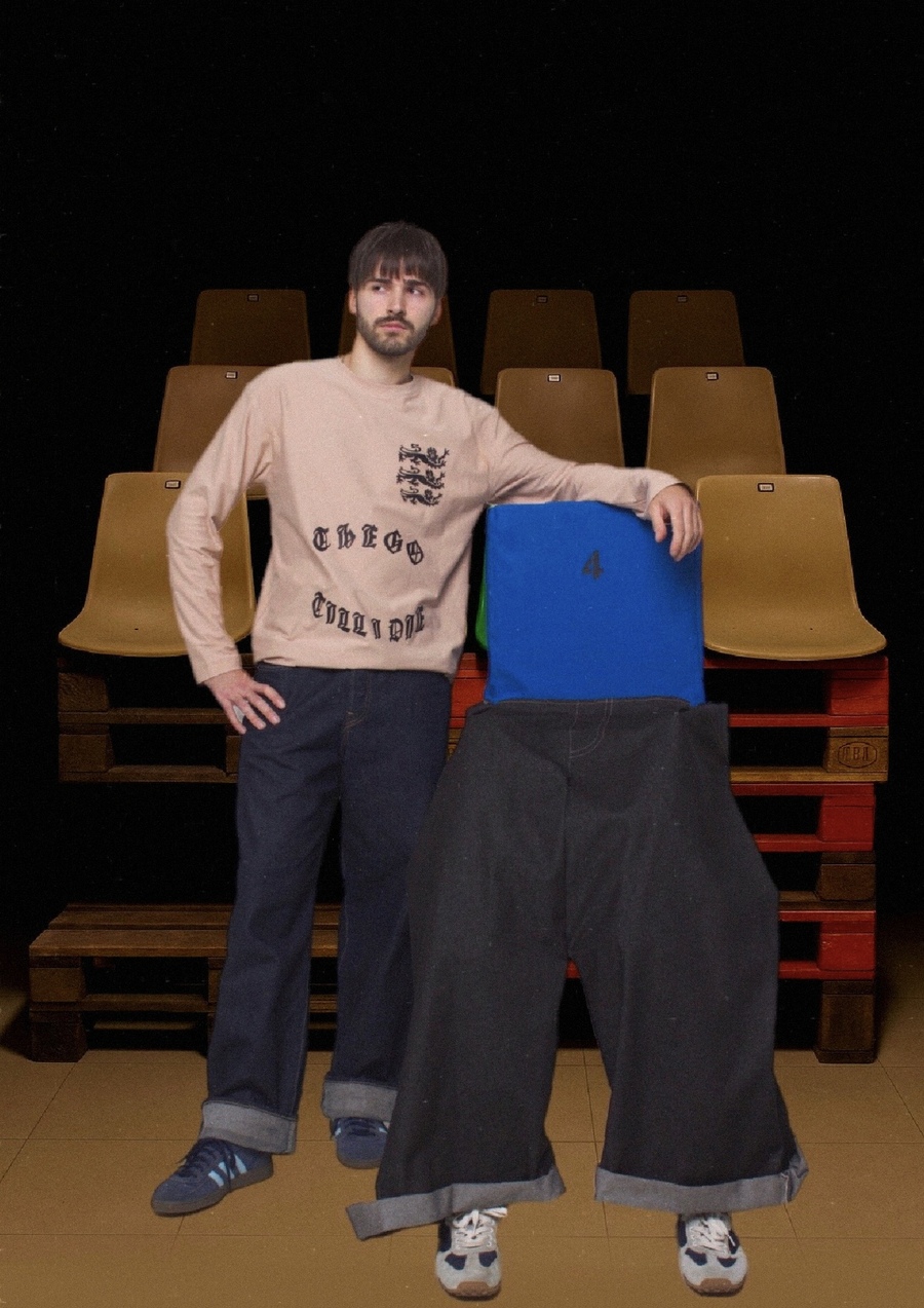 Образ «Человек-трибуна» основывается на атмосфере футбольного стадиона. Это метафора фаната, который не просто наблюдает за игрой, а становится частью пространства футбольного ритуала. Трибуна носит болельщика, а болельщик носит трибуну — границы между объектом и человеком стираются, превращаясь в единую форму фанатской идентичности.