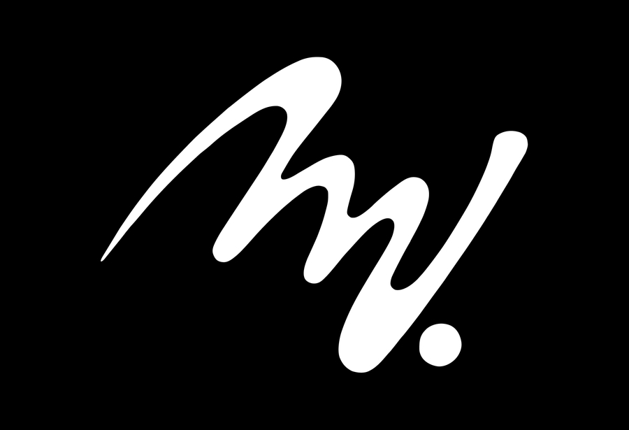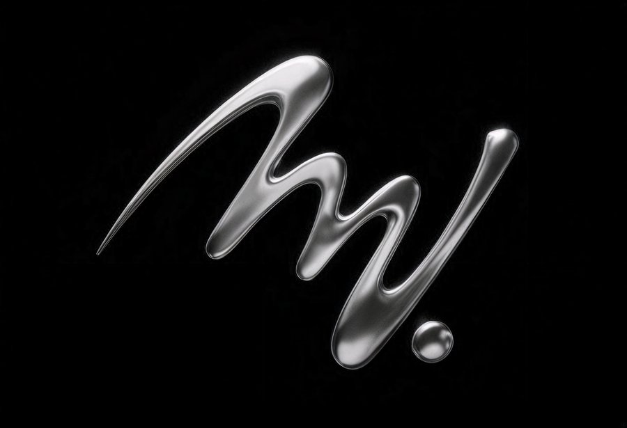 Krea.ai: «m.» symbol designed as a metallic emblem — line is slightly wave-shaped, smooth and precise, like engraved metal. subtle cold white internal light, y2k, dark background, realistic render
