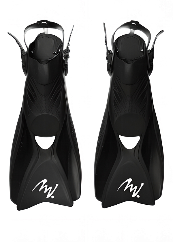 Krea.ai: Black dive fins, rubber and plastic construction, with adjustable straps. Two fins shown from the front, perfectly aligned and centered on a stark white background. Minimalist fashion product shot, professional lighting.