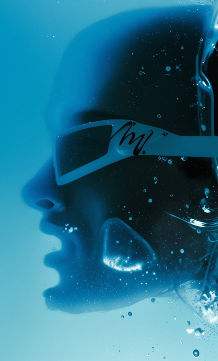 Krea.ai: cinematic underwater portrait of a man in profile, head slightly tilted upward, captured through water with bubbles and dynamic splashes. Blue lighting with a gradient from deep cyan to turquoise. The man wears a swimming mask instead of sunglasses, with reflections and water distortions creating an ethereal, futuristic vibe. The photo has a soft focus and dreamy, surreal atmosphere. Realistic lighting, macro close-up, ultra-detailed textures of skin and water, fine droplets, and transparency effects.