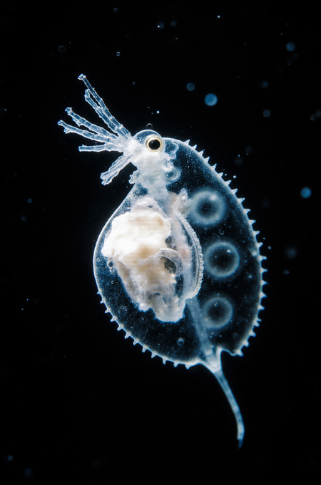 Krea.ai: ultra-realistic close-up photograph of a single microscopic Daphnia organism floating underwater — captured in a deep cyan-blue aquatic environment. The water is illuminated with soft, spectral blue light and tiny air bubbles drift around. The Daphnia’s translucent silica shell is semi-transparent, glowing faintly with inner reflections of light, showing detailed textures, holes, little eye, round organs inside, and organic lattice structure. Depth of field is shallow, background softly blurred, like a macro underwater photo. Lighting similar to an artistic underwater portrait — dramatic and cinematic, with refraction and caustics on the surface. hyper-realistic, cinematic, 8k, photo-real macro lens shot.
