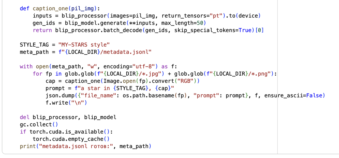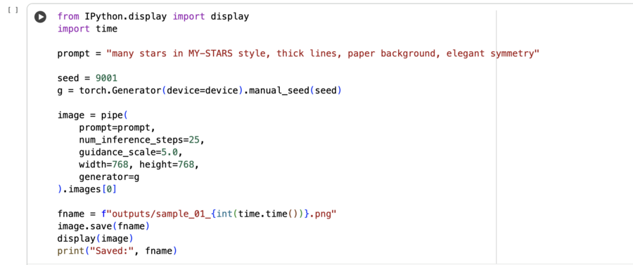 Обучить лёгкий адаптер LoRA на основе Stable Diffusion XL, способный передавать характер моих ручных рисунков звёзд, выполненных синей шариковой ручкой на белой бумаге. Проект демонстрирует, как при помощи небольшой выборки авторских изображений можно передать выразительность и «живость» линии, сохранив узнаваемость формы и характер штрихов.