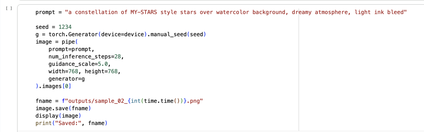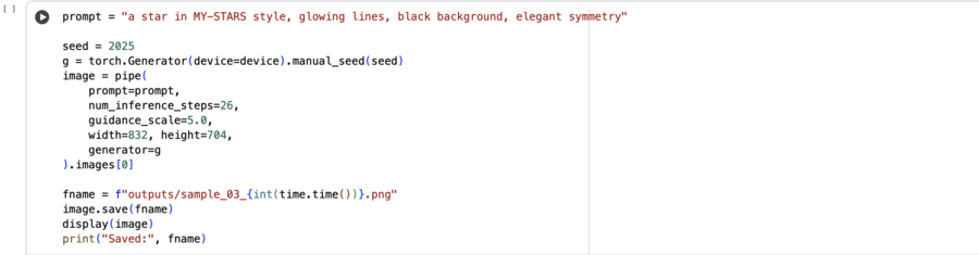 Задача состояла не в копировании конкретных изображений, а в обучении модели улавливать пластичность линии, рукописный контур и лёгкий дрожащий след ручки, характерный для моих оригинальных рисунков. Таким образом, нейросеть должна уметь порождать новые композиции звёзд, при этом сохранять ощущение, что они созданы человеком от руки, а не сгенерированы алгоритмом.
