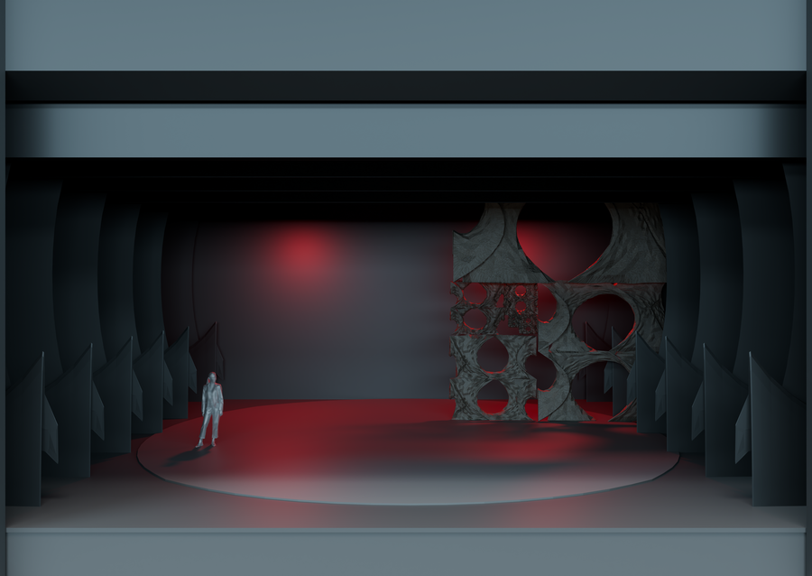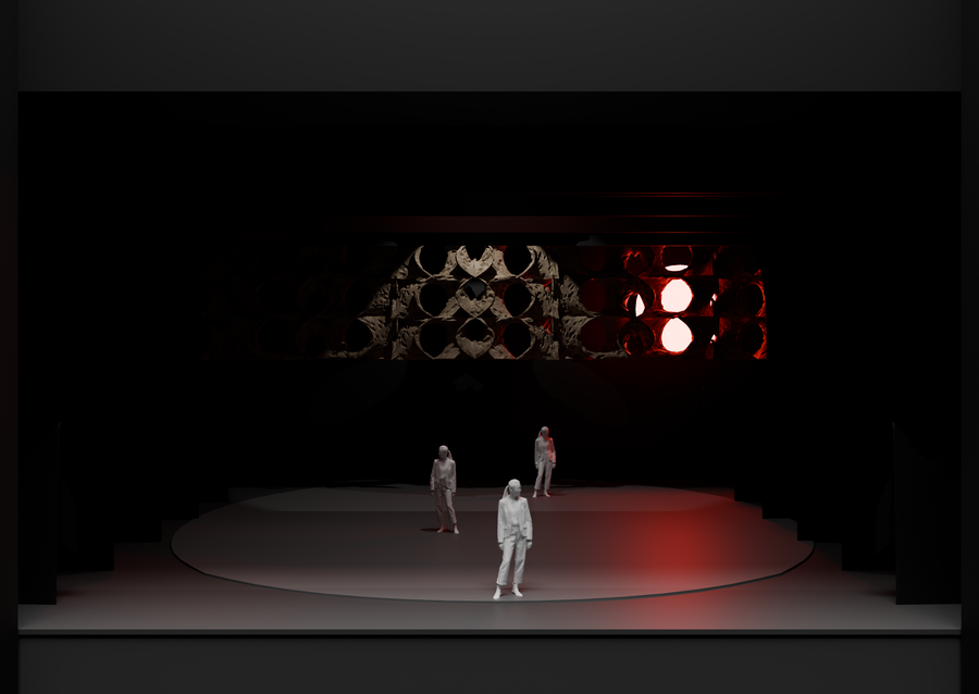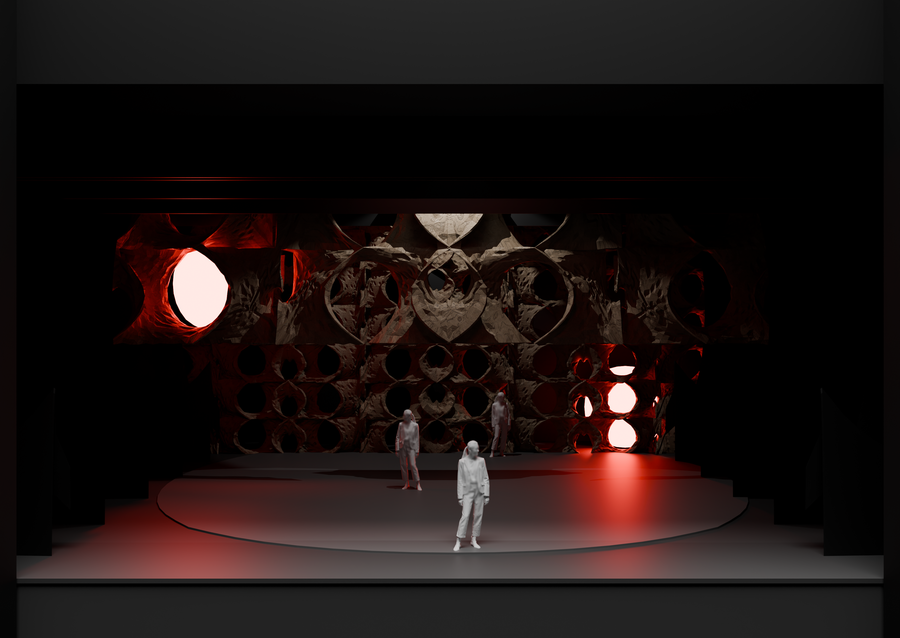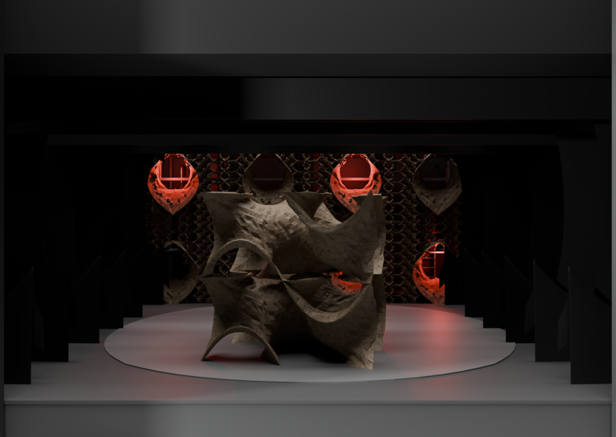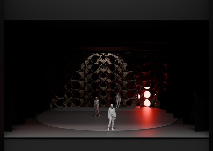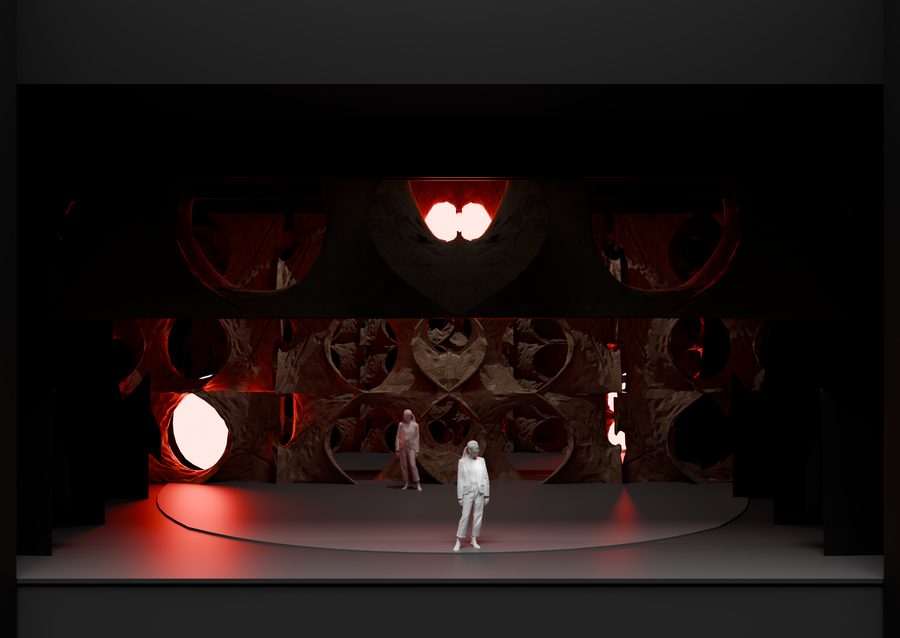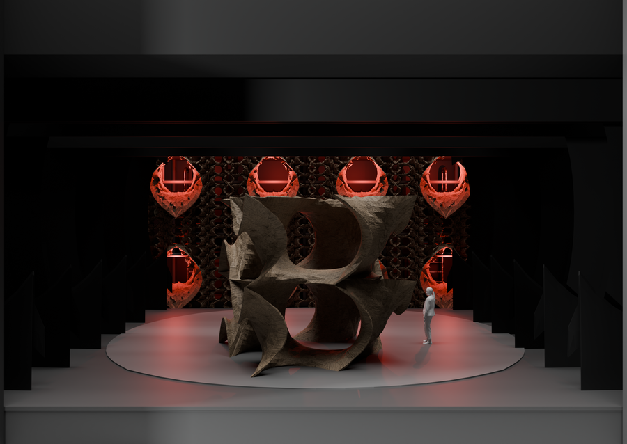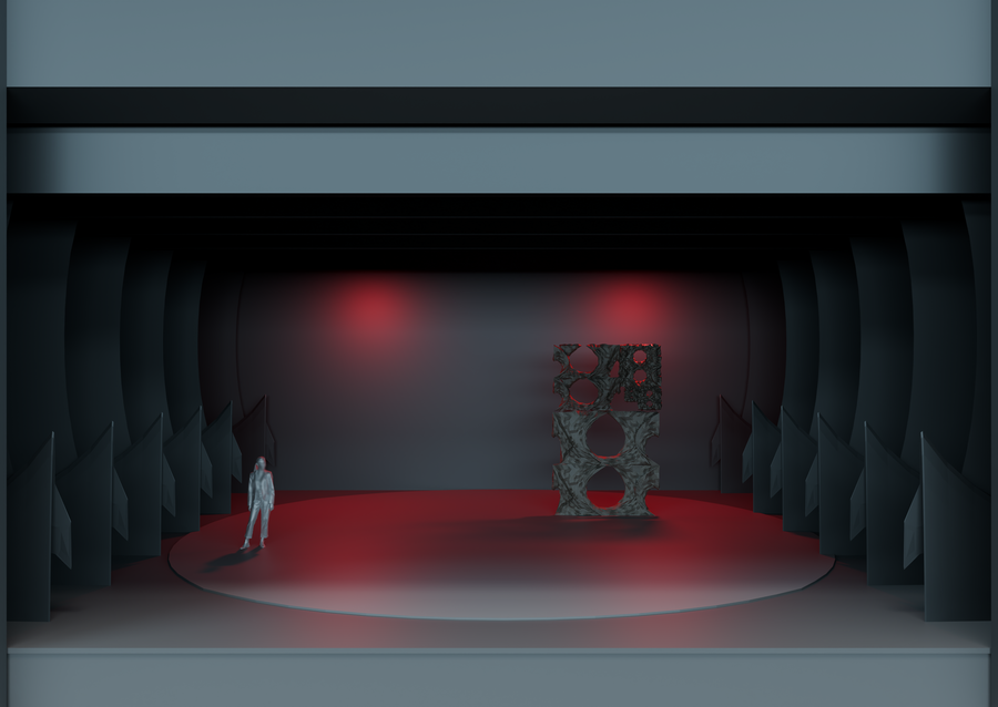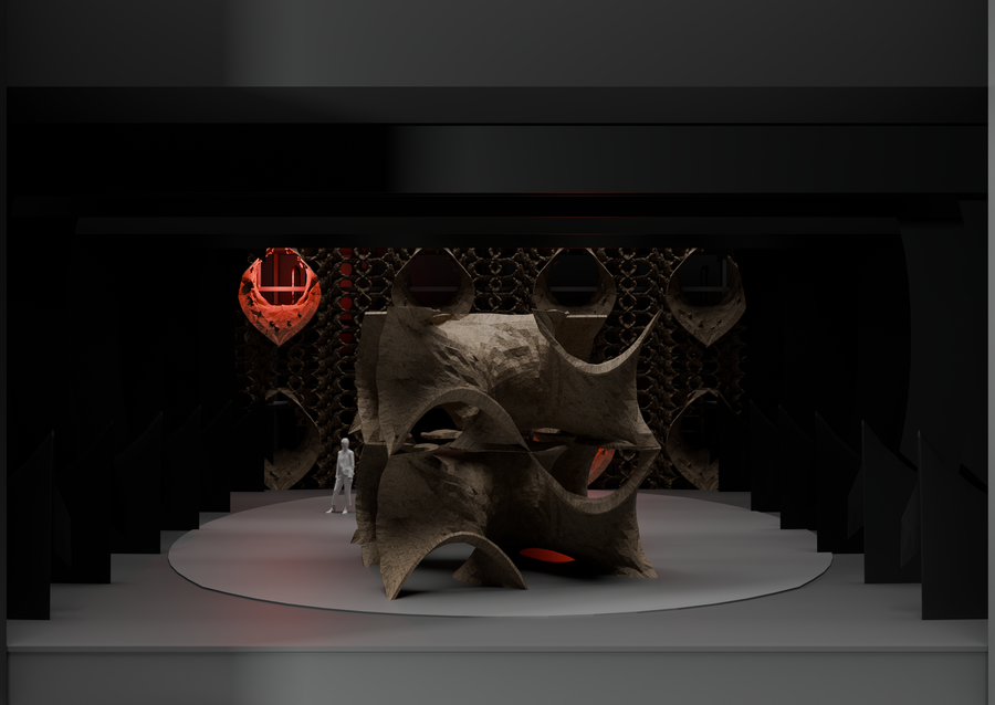 «Орестея» — выдающаяся трагедия Эсхила, состоящая из трех частей: «Агамемнон», «Жертва у гроба» и «Эвмениды». Главным решением в сценографии было найдено выстраивание пространства из единого модуля. Его сборка и конфигурации позволяют создать «бесконечное», замкнутное, давящее пространство. Персонажи помещаются в абстрактной локации без входа и выхода, что создает нужный эффект лиминальности и согласуется с лейтмотивом проклятия Атридов. Такой модульной формой был выбран гироид — вечно пересекающая свои плоскости кубическая структура.