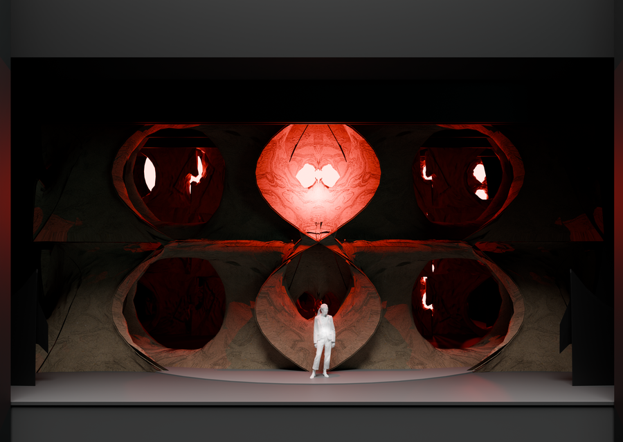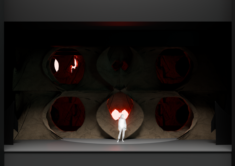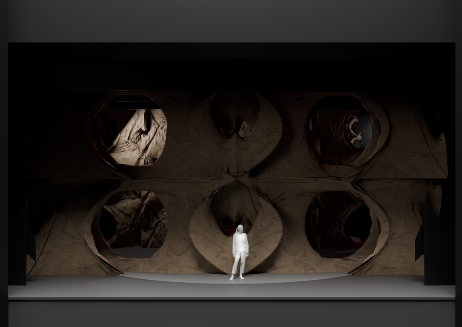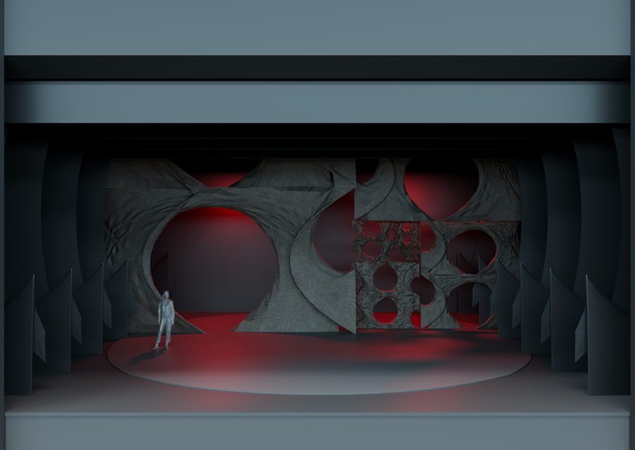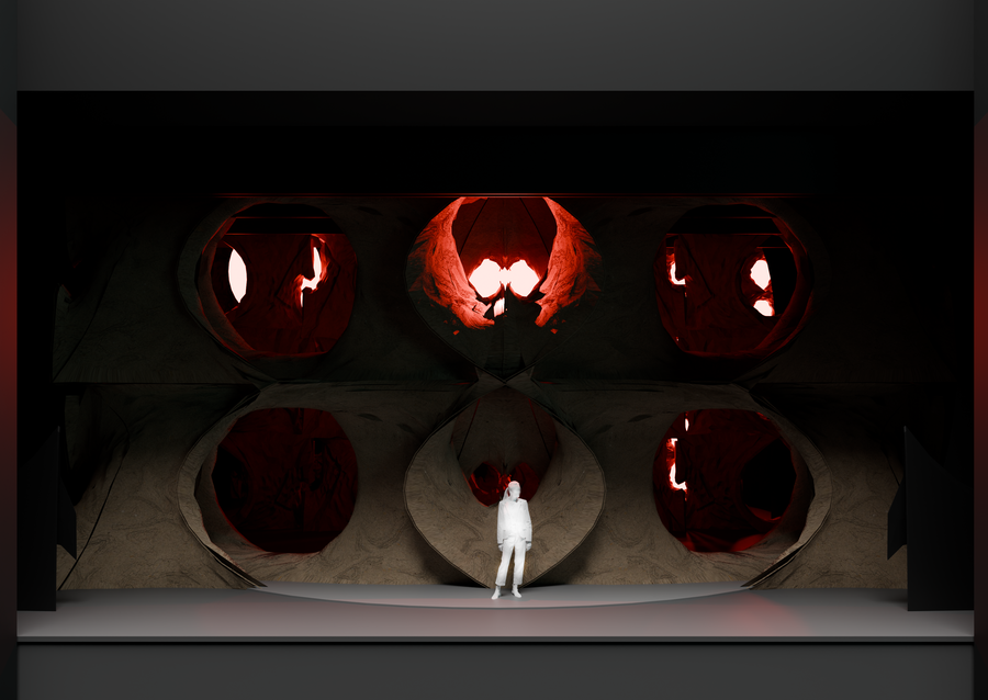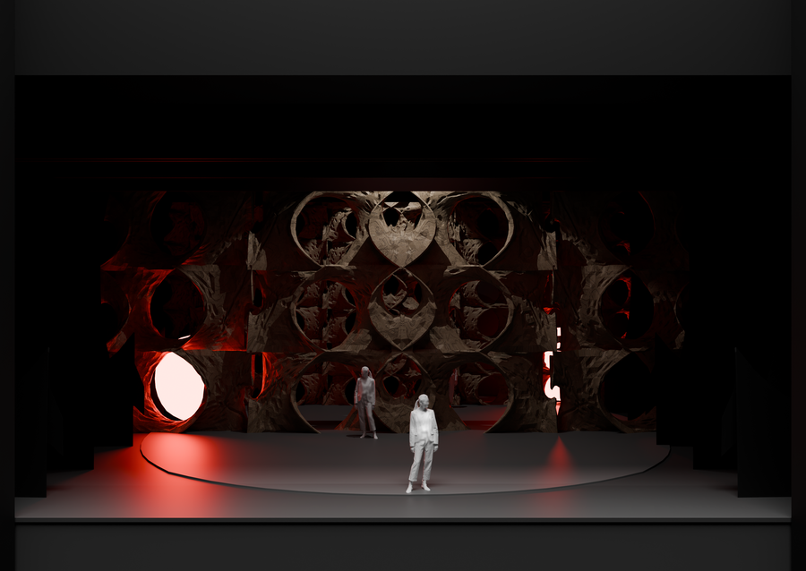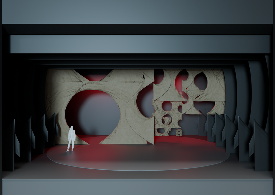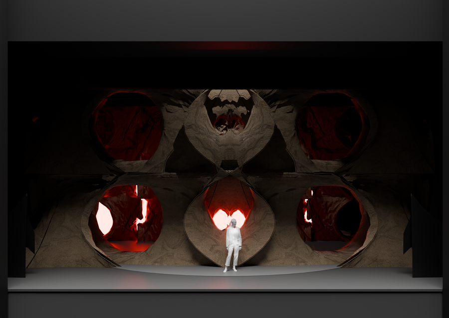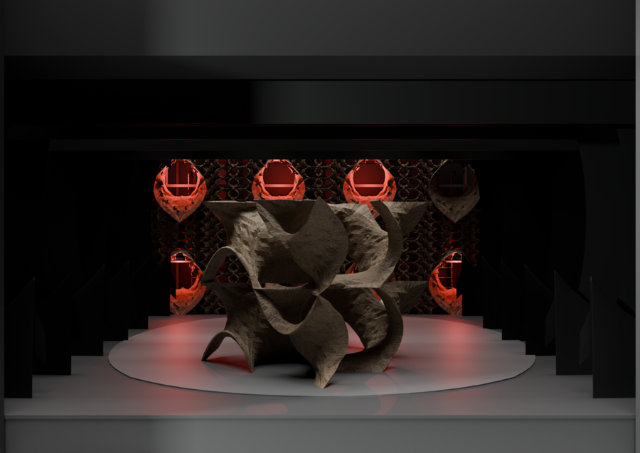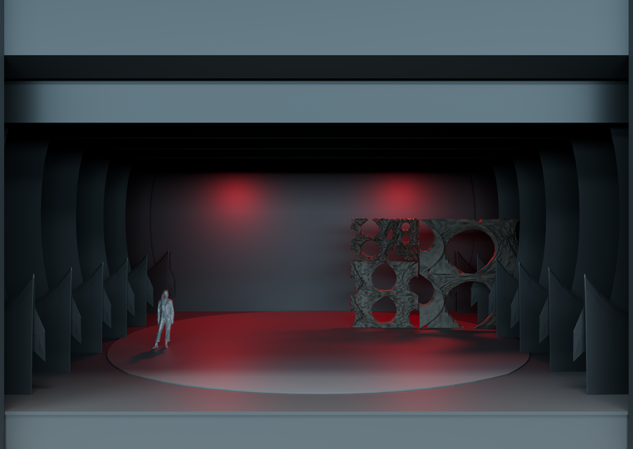 «Орестея» — выдающаяся трагедия Эсхила, состоящая из трех частей: «Агамемнон», «Жертва у гроба» и «Эвмениды». Главным решением в сценографии было найдено выстраивание пространства из единого модуля. Его сборка и конфигурации позволяют создать «бесконечное», замкнутное, давящее пространство. Персонажи помещаются в абстрактной локации без входа и выхода, что создает нужный эффект лиминальности и согласуется с лейтмотивом проклятия Атридов. Такой модульной формой был выбран гироид — вечно пересекающая свои плоскости кубическая структура.