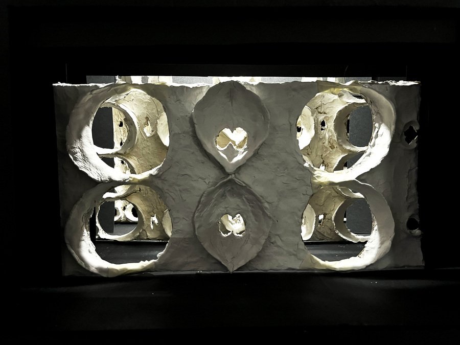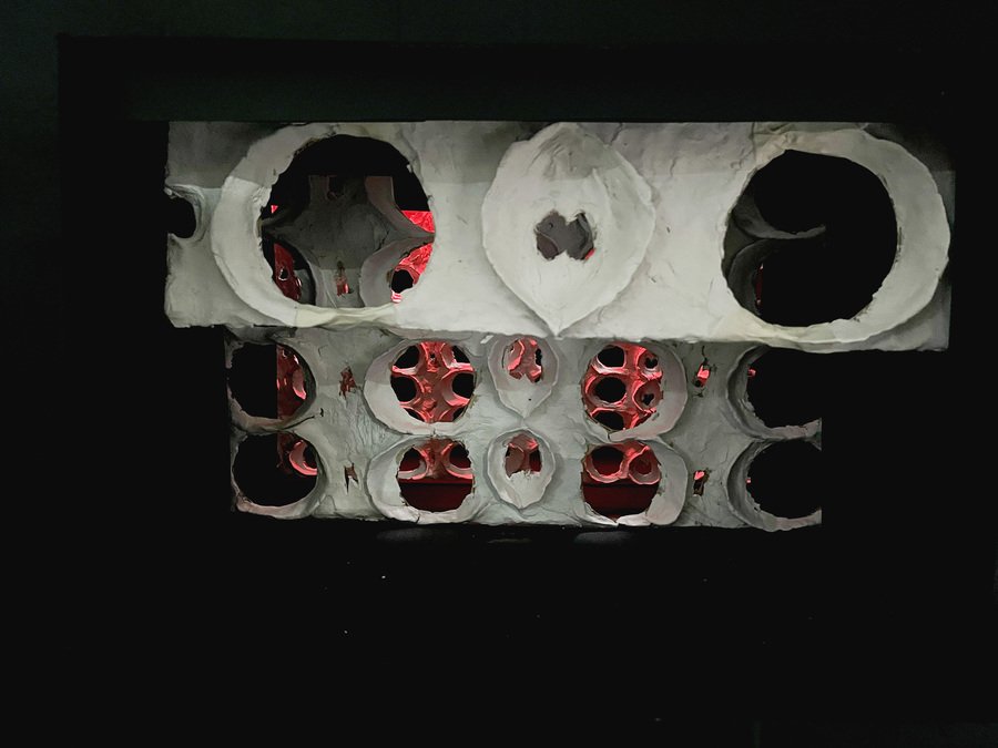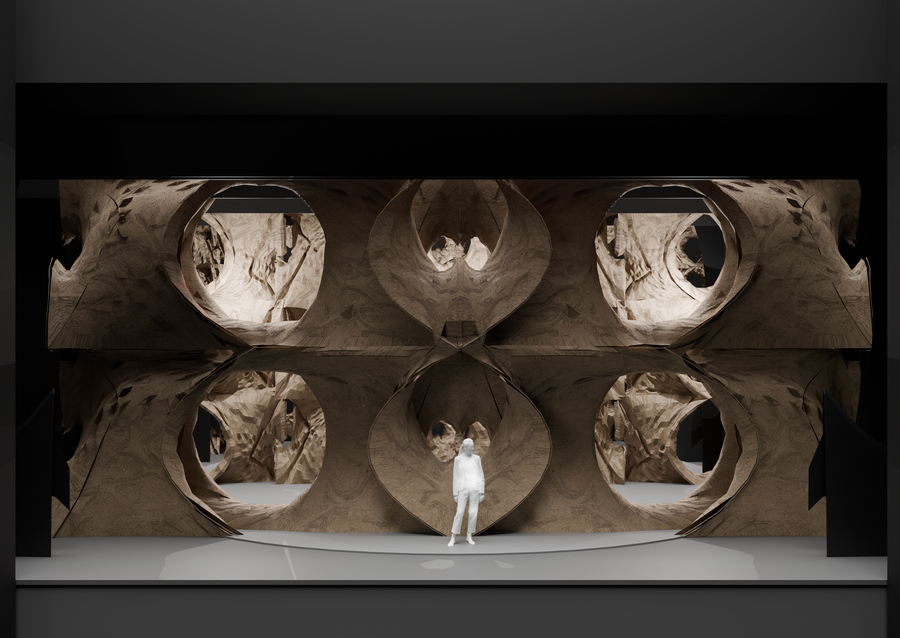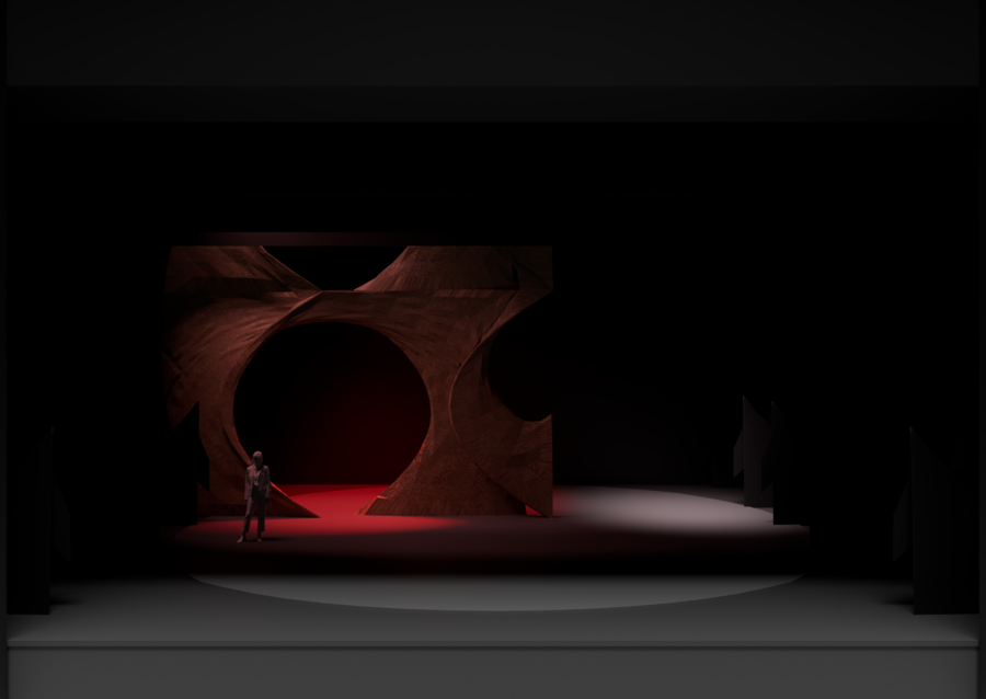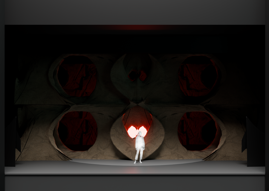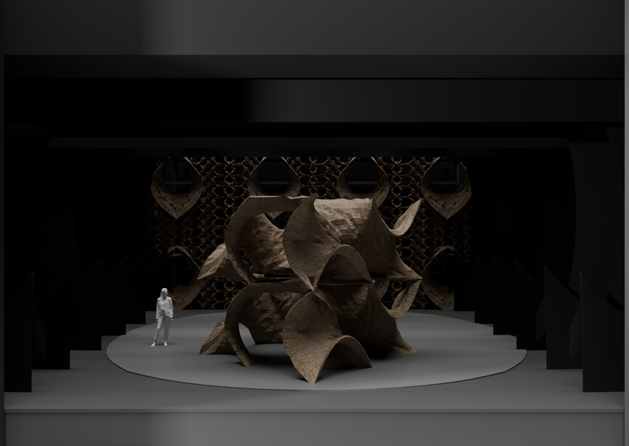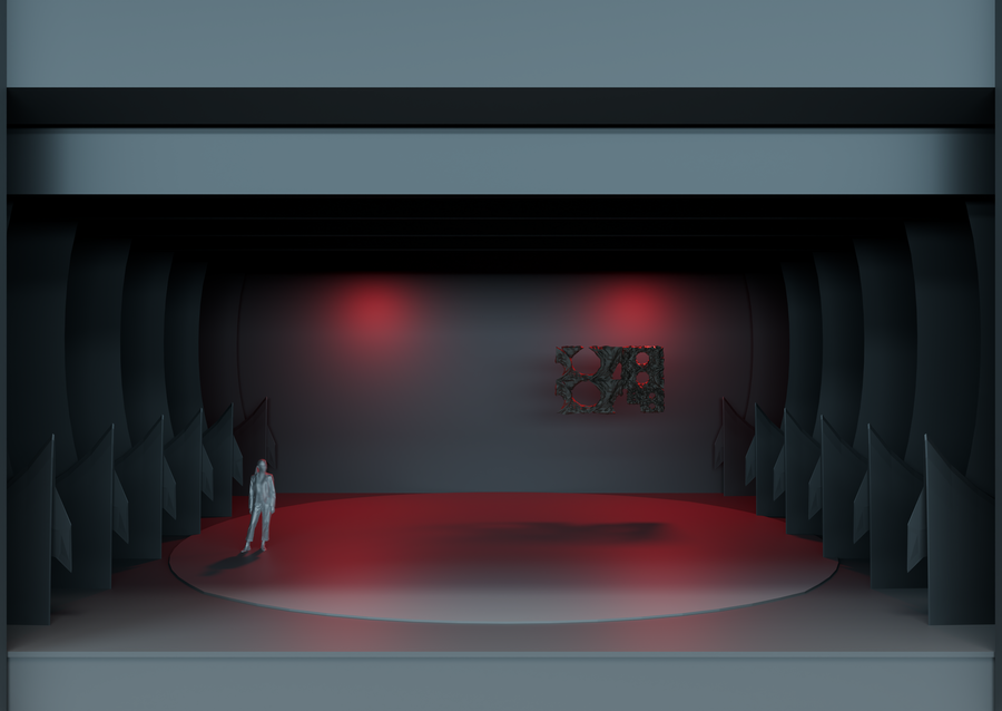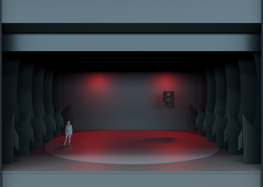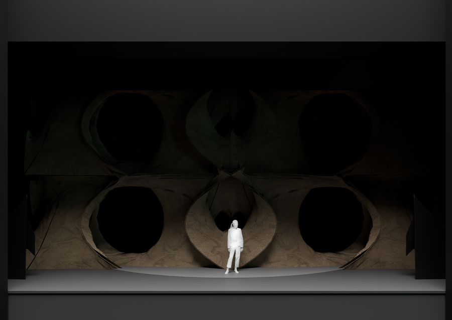 «Орестея» — выдающаяся трагедия Эсхила, состоящая из трех частей: «Агамемнон», «Жертва у гроба» и «Эвмениды». Главным решением в сценографии было найдено выстраивание пространства из единого модуля. Его сборка и конфигурации позволяют создать «бесконечное», замкнутное, давящее пространство. Персонажи помещаются в абстрактной локации без входа и выхода, что создает нужный эффект лиминальности и согласуется с лейтмотивом проклятия Атридов. Такой модульной формой был выбран гироид — вечно пересекающая свои плоскости кубическая структура.