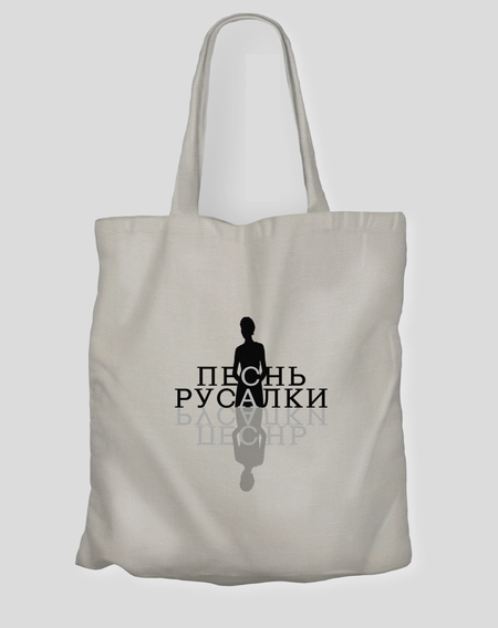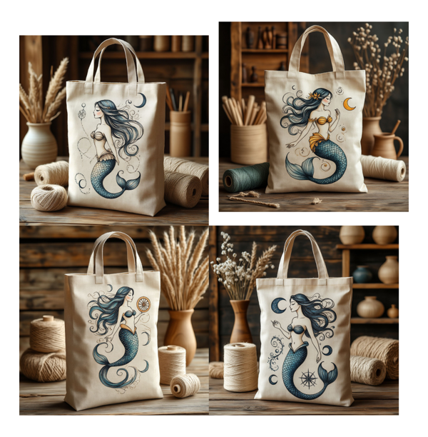 Мокап эко-сумки из натурального льна для проекта «Песнь Русалки». Эскиз на сумке: изящная, стилизованная русалка с длинными волнами волос, переплетающимися с символами луны, воды и судьбы (нити, прялка). Сдержанная цветовая гамма, бежевый фон, графичная черная или темно-синяя линия. Нейросеть Алиса