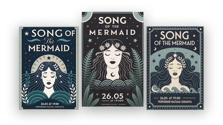 Винтажная театральная афиша 1920-х годов, стиль Ар-Деко. Стилизованное графическое изображение лица славянской богини с закрытыми глазами. Ее волосы — это речные потоки, в которых плывут лунные лики и звезды. Композиция обрамлена орнаментом из папоротника и волн. В центре, крупным винтажным шрифтом — заголовок «Song of the Mermaid». В нижней части плаката, в прямоугольной рамке, элегантным шрифтом набрано: «26.05 in 19:00» и «Performer Nastasia Sudakova». Цветовая палитра: темный ультрамарин, серебро, черный, слоновая кость. Нейросеть Recraft.Ai
