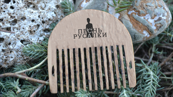 Мокап деревянного гребня для волос в славянском стиле для проекта «Песнь Русалки». Резной ажурный узор: в центре стилизованная Лунница, от которой расходятся волны, переплетающиеся с защитными символами (семьи, плодородия, воды). По бокам — зубцы в форме листьев папоротника. Цвет: натуральное дерево с легким затемнением для прорисовки деталей. Стиль: этнический минимализм. Нейросеть Алиса