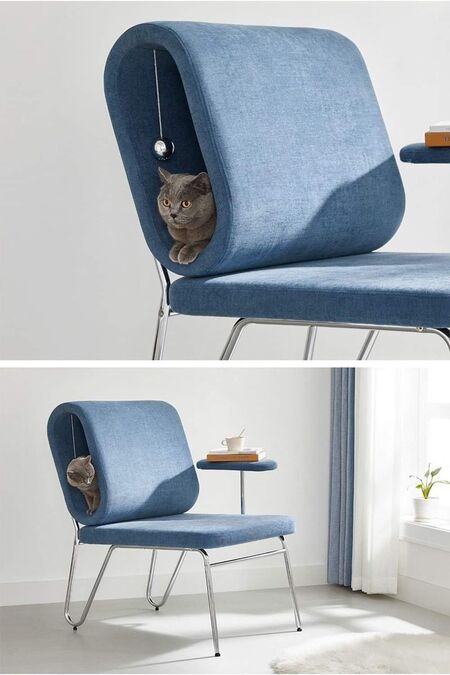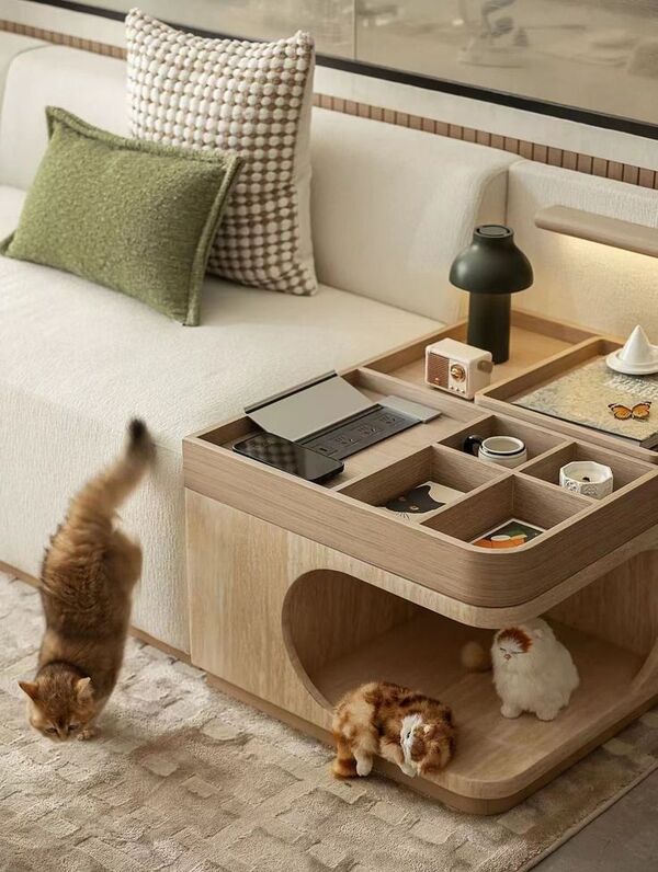 Встраиваемый и многофункциональный дизайн: каркас для лазания по кошкам сочетается с книжной полкой, конура становится частью основания дивана, а ящик для кошачьего туалета прячется в боковой шкаф.Дизайн направлен на экономию пространства и улучшение визуальной целостности.