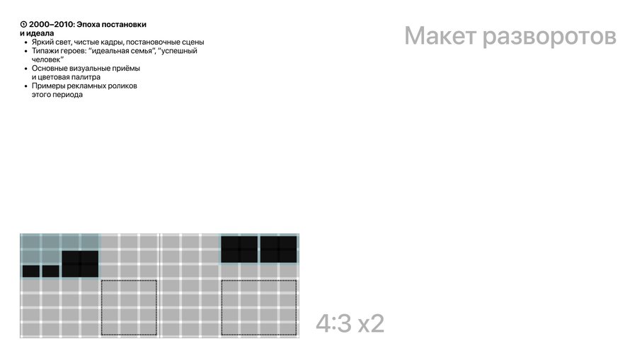 ➀ 2000–2010: Эпоха постановки и идеала - Яркий свет, чистые кадры, постановочные сцены - Типажи героев: «идеальная семья», «успешный человек» - Основные визуальные приёмы и цветовая палитра - Примеры рекламных роликов этого периода