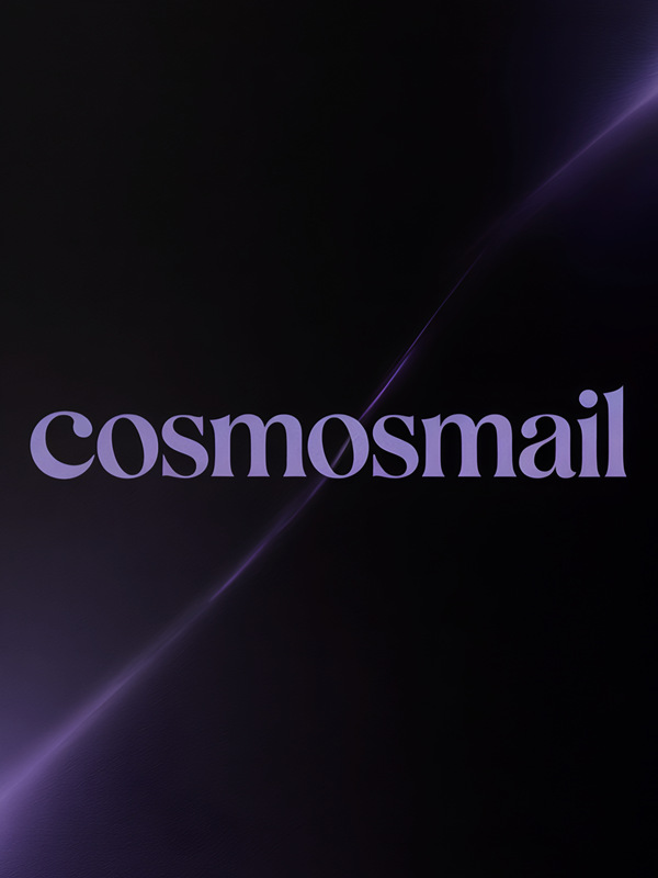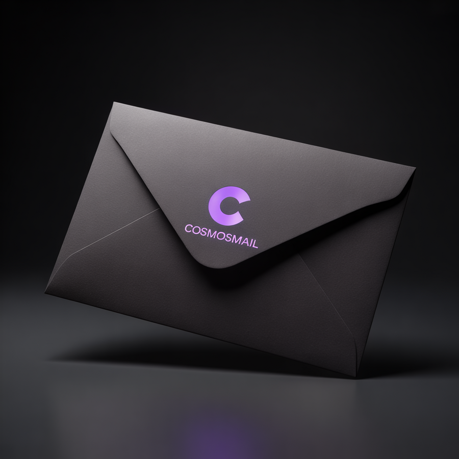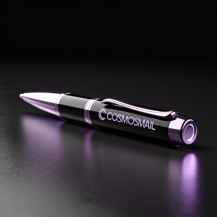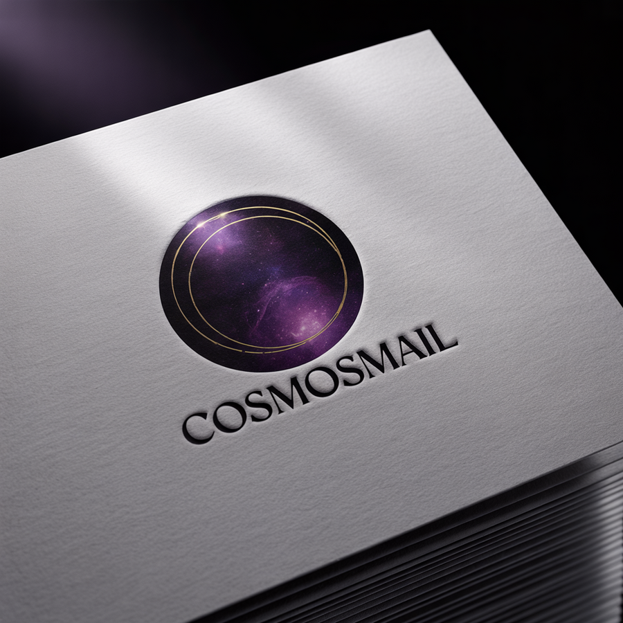 Промт: создай носители с логитопом «cosmosmail» - на черном конверте. Логотип фиолетовый - печать на бумаге с черным логотипом и фиолетовой печатью. На печати изображен космос. - черная ручка с фиолетовым логотипом. Фон черный.