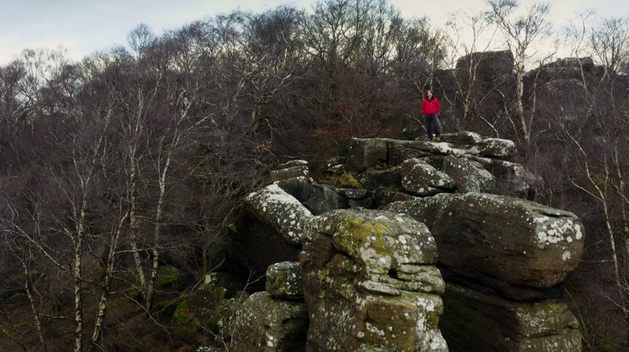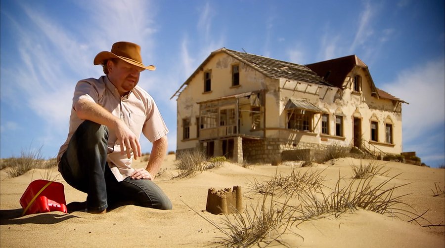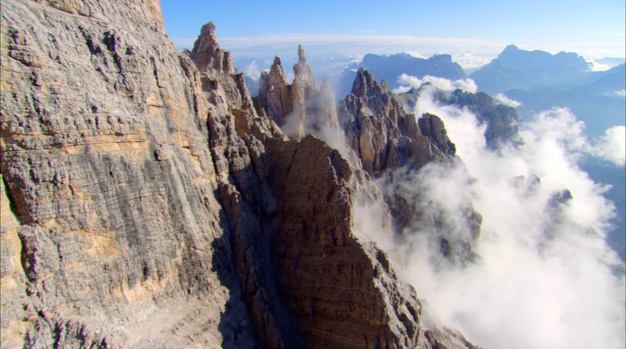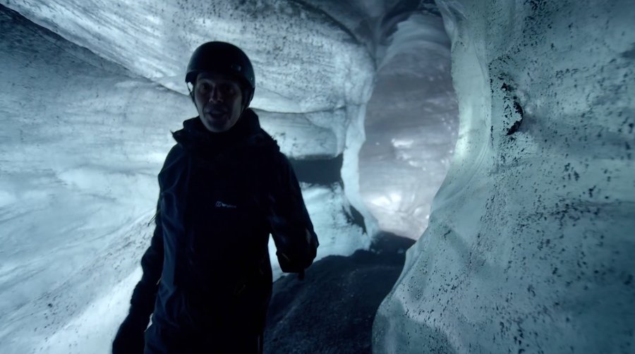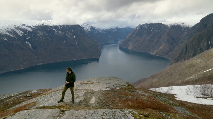 Но не только кадры с высоты птичьего полета помогают передать эти идеи. Например, очень интересны сцены, когда сначала крупным планом дается фигура ведущего, а потом камера плавно отдаляется и переходит на план с контрастными масштабами природы и человека. Такой подход можно соотнести с сюжетной веткой повествования в мини-сериалах, которая начинается с рассказа о человеке и заканчивает максимально отдаленными научными концептами о космосе.