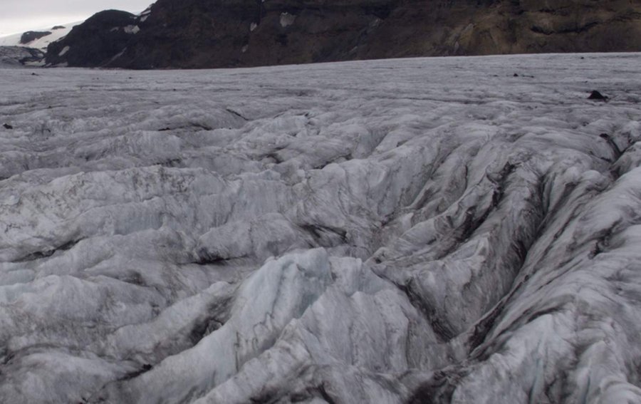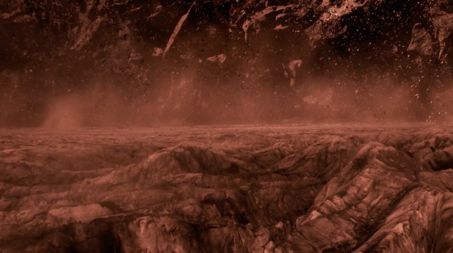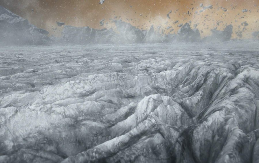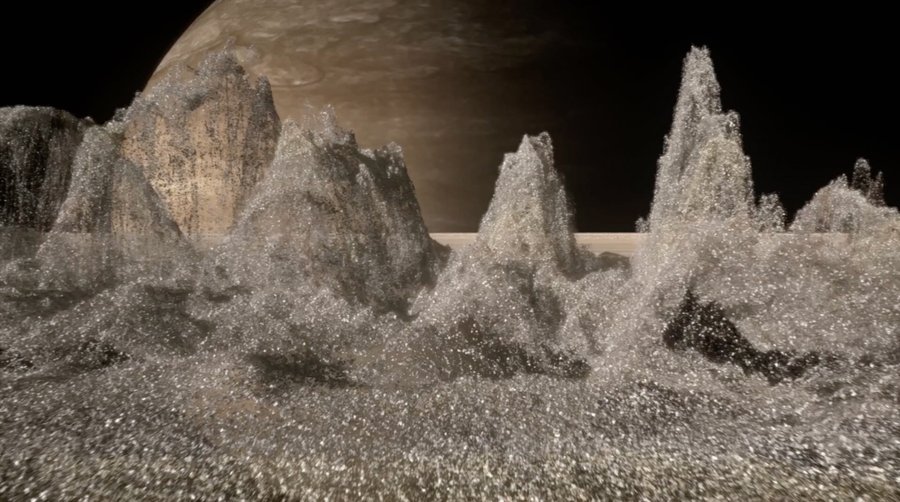 Так, буквально подчеркивается идея того, что природа Земли может быть принята за константу в рамках ландшафтной специфики других планет Вселенной. Пользуясь этой идеей, «Lola» находит в пейзажах на Земле визуальные мотивы и ритмы, которые напоминают инопланетные миры, и берет их за основу, позднее добавляя к ним непосредственно графику. Например, для одной из сцен в «Планетах» были отсняты кадры ледника Соульхеймажкютль (eng. Sólheimajökull), находящегося в южной части Исландии [1]. Примечательно, что это один из самых крупных ледников и при этом у него очень выразительная, острая и резкая фактура. Именно она ложится в основу визуализации ранних стадий существования Сатурна, а именно сцены схода с кольца одного из его спутников. Тогда Сатурн еще не был газовой планетой, а состоял полностью из камня и льда также, как и его кольца. И соответственно легко представить, что фактура поверхности Сатурна была достаточно похожа на ледник, ведь они оба имеют одинаковый материал и форму образования.