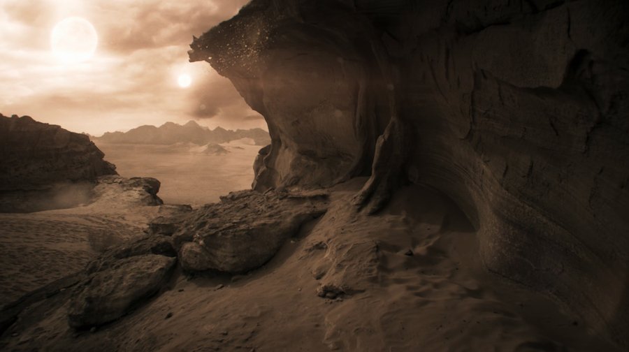 И такой принцип сохраняется во всех сценах, где природа использована за основу для ландшафта. Сначала выбирается определенное место: каменистое, с минимальной растительностью и безлюдное. Позднее на него накладывается соответствующая визуальная графика, световая и цветовая коррекции, которые преображают его в незнакомый, но при этом немного понятный мир. При этом такой подход также помогает избежать создания неубедительной, «картонной» графики. Из-за того, что многие кадры космоса изначально базируются на реально снятых объектах природы, в них автоматически закладывается знакомые зрителю визуальные паттерны.