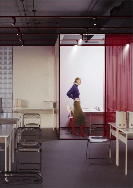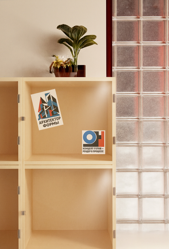 Концепция корпусной мебели вдохновлена одним из предыдущих проектов — учебным кластером в стенах завода Канатного цеха и нового корпуса НИУ ВШЭ. Учебный кластер был выполнен в конструктивистском стиле и вдохновлен работами Якова Чернихова, поэтому мебель юудет выполнена из листов фанеры с использованием красного и синего оттенков.