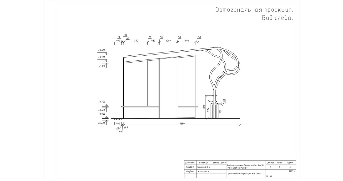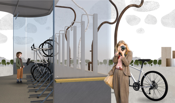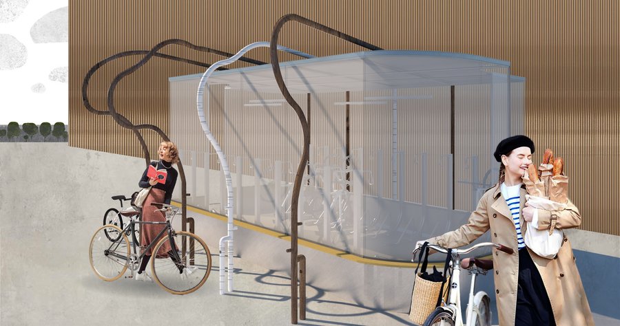 С точки зрения формообразования четыре внешних крепления — вместе с внутренними местами дающих возможность разместить указанный в ТЗ объем велосипедов (24 штуки) — очевидно вдохновлены изгибами коряг и веток, «найденных ребёнком на берегу».