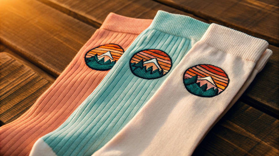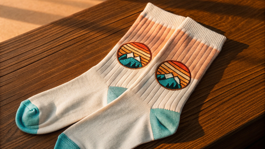Промпт для Recraft.Ai: Create a cinematic product photograph of travel thermo socks from the lifestyle brand Rachel Roads. The socks are laying on a wooden table. Each sock features an embroidered patch of a stylized sunrise with mountains. Style: retro Americana meets modern minimalism — cozy, adventurous, and stylish. Colors: coral, turquoise, and cream accents from the Rachel Roads palette. Lighting: warm golden-hour sunlight with soft shadows highlighting the fabric texture.Top view composition. Style: Profuct photo