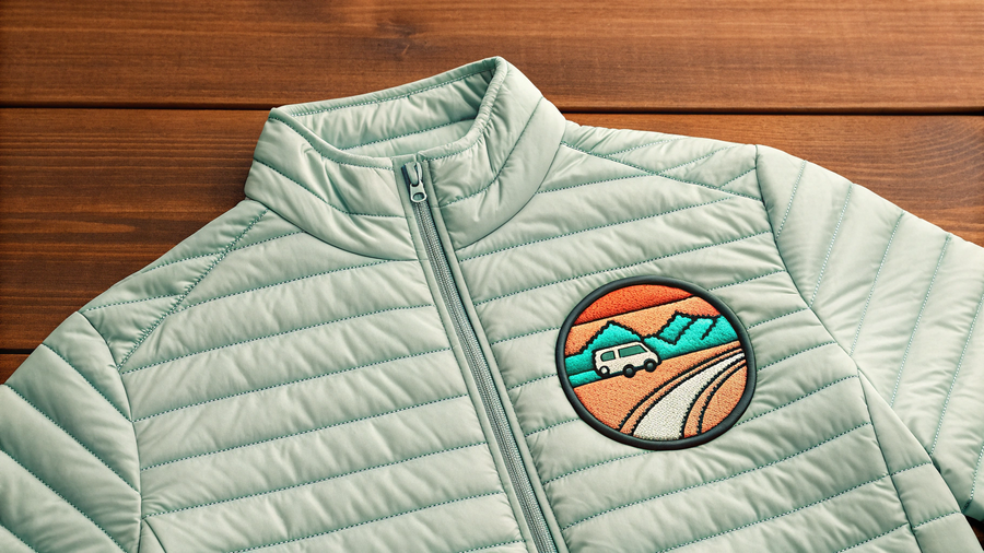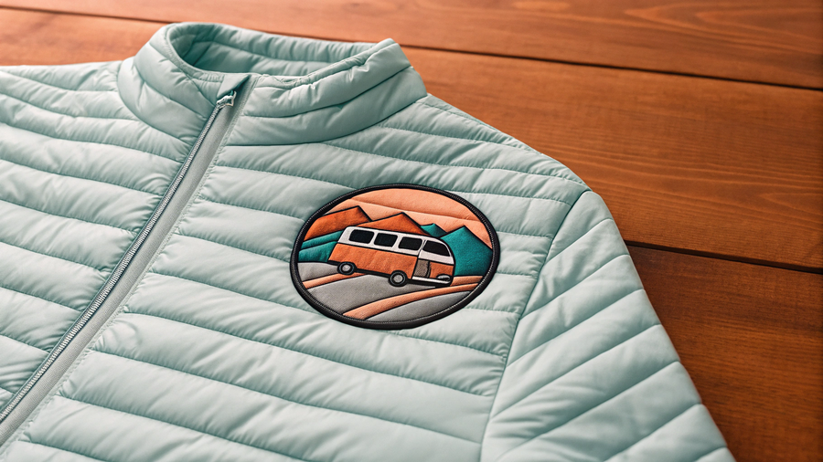 Промпт для Recraft.Ai: Create a cinematic product photo of a lightweight puffer jacket with no hood. The jacket features a small Rachel Roads embroidered patch, depicting a stylized van driving along a winding road, with bold clean outlines, circular shape, and coral, turquoise, and cream colors. Background is wooden table. Tow-view composition. Style: retro Americana meets modern minimalism, warm nostalgic tones, highly detailed fabric texture.