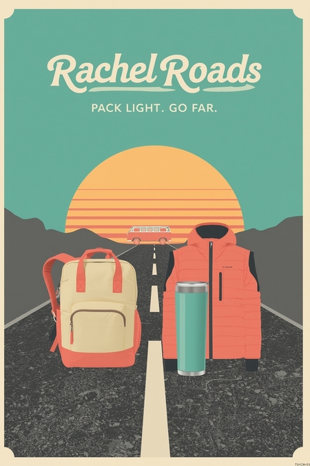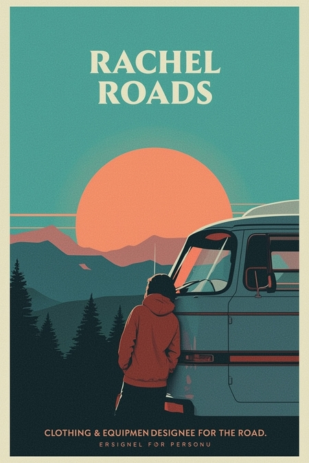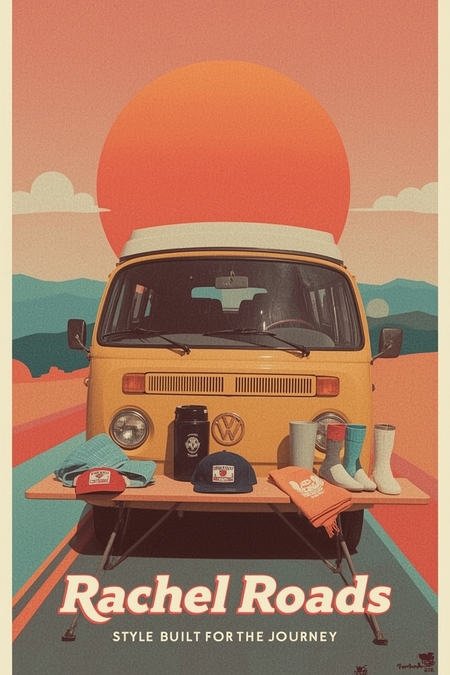 Промпт для Leonardo.Ai: Create a vector-style advertisement poster for Rachel Roads, a travel-inspired clothing and gear brand. Show a stylized retro van parked by a road, with hats, socks, and a travel mug neatly arranged on a picnic table or bumper. Background: minimal sunset landscape with clean shapes and coral–turquoise tones. Style: 1960s travel poster meets modern minimalism. Add large retro typography ‘Rachel Roads’ along the bottom and small tagline: ‘Style Built for the Journey.’ Composition: product-focused, minimal, aspirational.