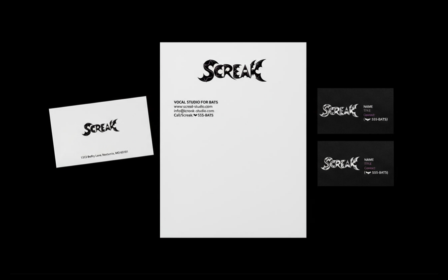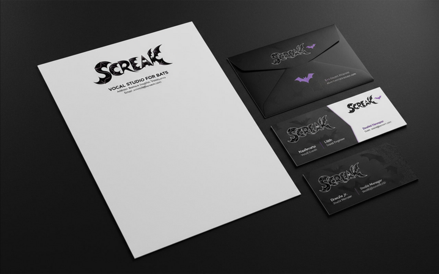 /create a business paper, envelope and business cards for the brand of vocal studio for bats using this logo and colors from it. The background is black.