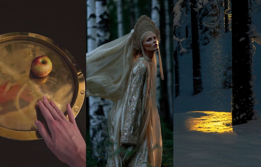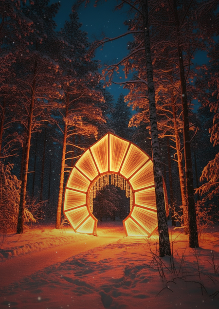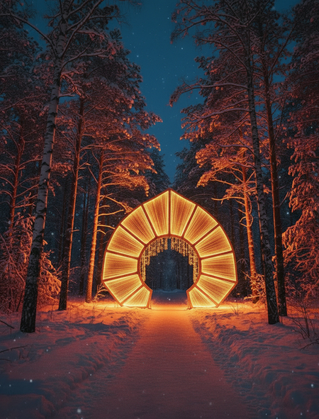 Главным элементом инсталляции стал переосмысленный образ традиционного русского кокошника, представленный в виде световых ворот, как сказочного элемента перехода в другой мир.