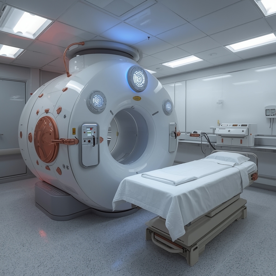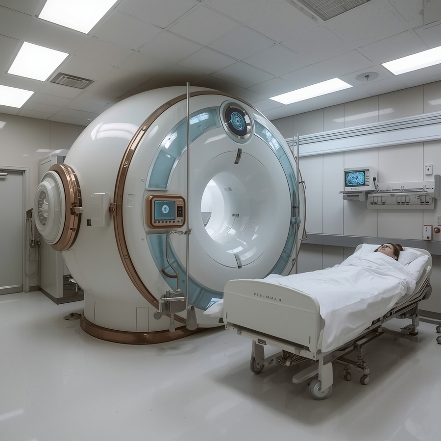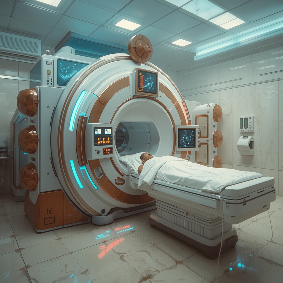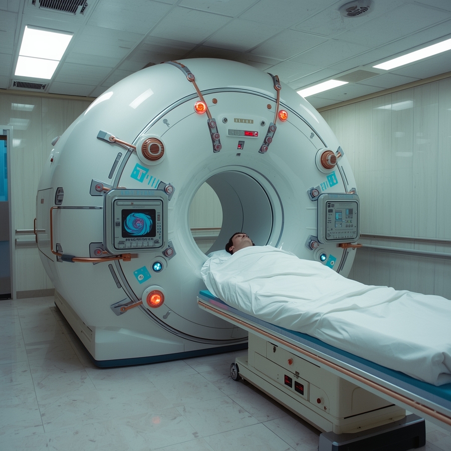 «A retro-futuristic memory-viewing machine resembling an MRI scanner, designed in warm sepia tones, smooth rounded lines, mid-century sci-fi aesthetics, showing a small screen with nostalgic memories. Detailed, cinematic lighting, isometric angle.»