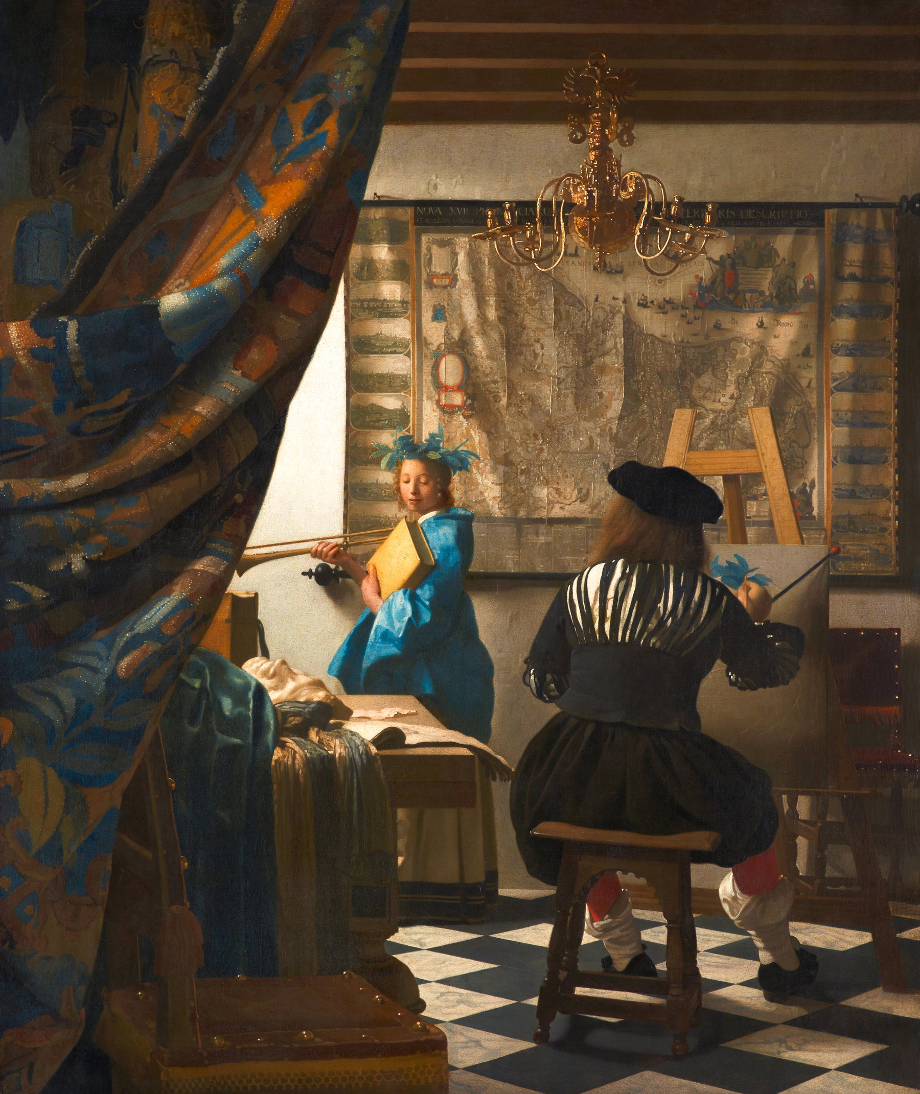 Художник сосредоточенно работает у мольберта в своей мастерской, запечатлевая стоящую у окна молодую женщину в венке из лавра, с трубой и книгой в руках… Этот сюжет, созданный Яном Вермеером в период Золотого века голландского искусства между 1666 и 1668 годами, носит название «Аллегория живописи» (или «Художник в мастерской»). Однако это не просто жанровая сцена; произведение наполнено глубоким аллегорическим смыслом. Натурщица олицетворяет древнегреческую музу истории Клио, а образ художника становится вневременным архетипом творца. Это гимн живописи, размышление о том, как искусство способно запечатлевать мимолетное и преобразовывать его в вечное.