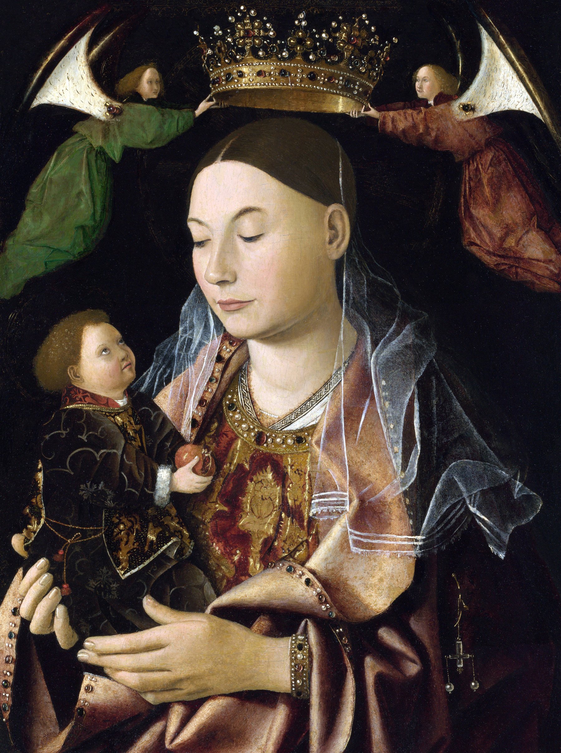 Картина «Мадонна с младенцем» (также известная как «Мадонна Салтинг» — по имени коллекционера Салтинга, владевшего ею в XIX веке) была создана в 1460-е. Её авторство традиционно приписывают Антонелло да Мессина — одному из важнейших мастеров итальянского Раннего Возрождения. На полотне изображены Дева Мария с младенцем Иисусом. Над Её головой два симметрично расположенных по обе стороны ангела в зелёных и красных одеждах возлагают на нее золотую корону, украшенную жемчугом и самоцветами. Этот элемент отсылает к иконографии «Коронования Девы Марии» — популярному сюжету в искусстве Ренессанса, подчёркивающему её статус Царицы Небесной.