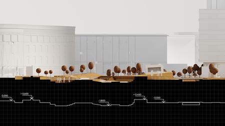 The modernization project concludes with a study of the spatial language of Theo van Dusburg through architectural and landscape forms. He interprets his ideas — from constructive rigidity to rhythm and asymmetries — in the structure of the urban environment. The space is organized as a system governed by the logic of planes, volumes and movements, without resorting to natural elements, which reflects Van Dusburg’s late views on art.