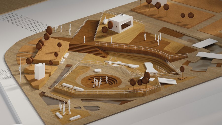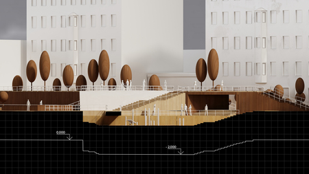 The area of the area consists of several functional and composite zones, which are combined into a single geometry. The central element is an in-depth round-form amphitheater designed for meetings, informal performances and observation. The amphitheater divides the terrace and step systems that form diagonal and orthogonal connections between levels. The area is divided into platforms of different heights, connected by stairways and ramps.