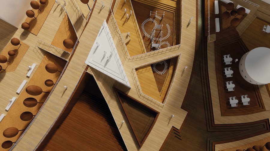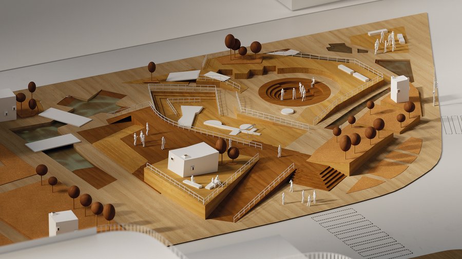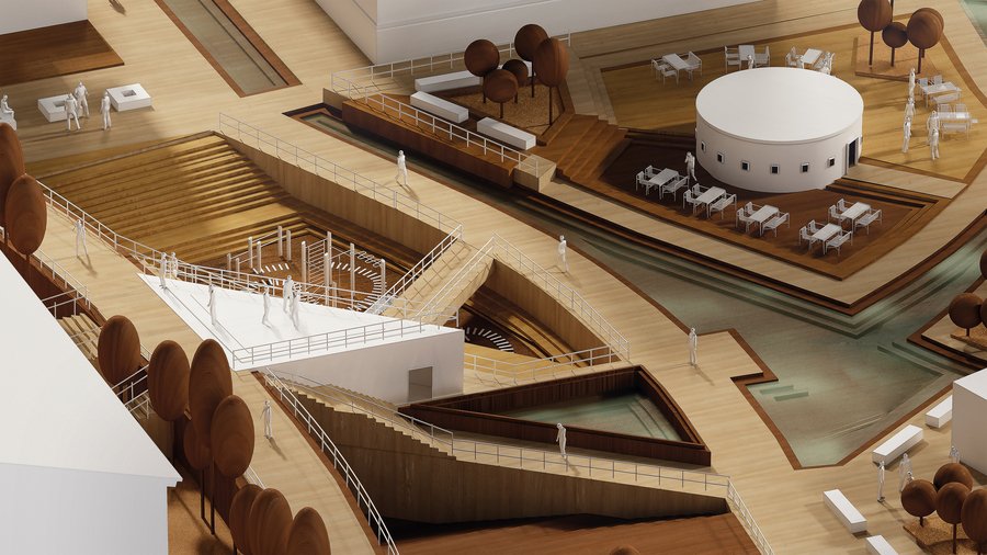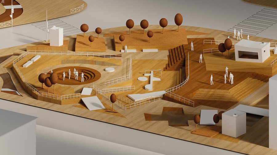 In my work, I deliberately used Leiden’s historical map as the basis for the composition. The plan of the precinct is based on the structure of the streets of the old city: I abstracted the channels, axes and blocks, transferring them to a system of levels, sites and spatial rhythms. So there was geometry, where each site, stairwell, or topography would leave a trace of Leiden’s topography — but already in abstract, architectural language. So the project connects the artist’s biography, the history of the city and the visual principles of the De Stijl movement into the architectural interpretation that is relevant today.