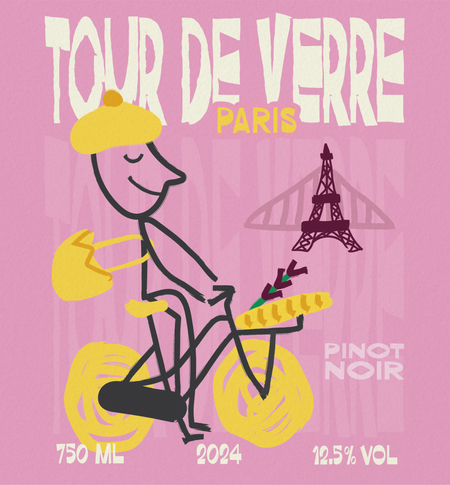 The image of Paris, framed as soft and romantic, reflects the smooth and refined character of the wine. The pink background and playful elements like the yellow beret and baguette evoke a sense of lightness and charm, just like the wine’s delicate and fragrant notes. The relaxed cyclist, eyes closed and enjoying the ride, mirrors the wine’s smooth, easy-drinking nature. The Eiffel Tower in the background adds a touch of elegance and familiarity, just as the wine offers a classic yet timeless appeal.