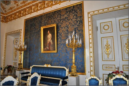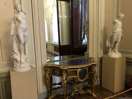 Гарнитур из 16 предметов в стиле Людовика XVI, работа русских мастеров, 1840-е г. / Синяя гостиная, отделка 1830-х годов архитектора А. А. Михайлова, «Незнакомка» В. К. Штембер, 1914 г.