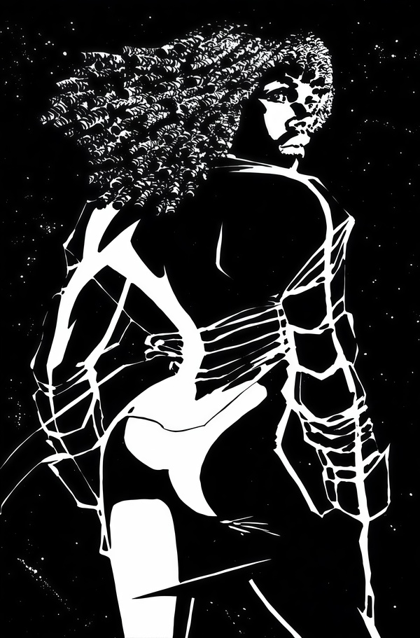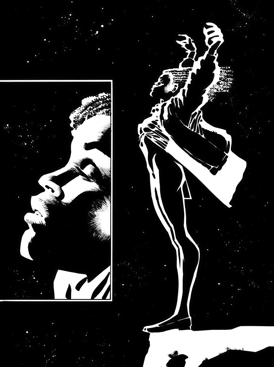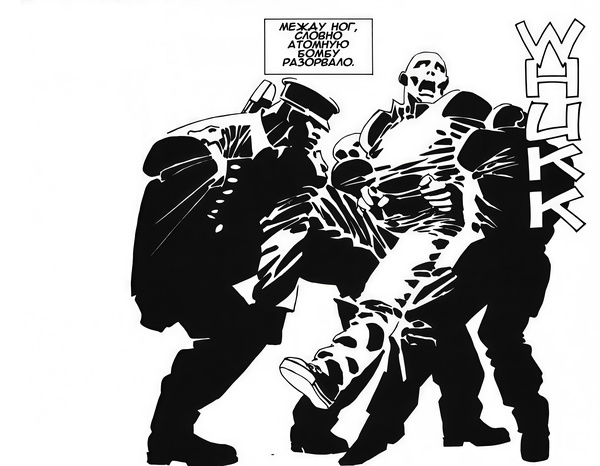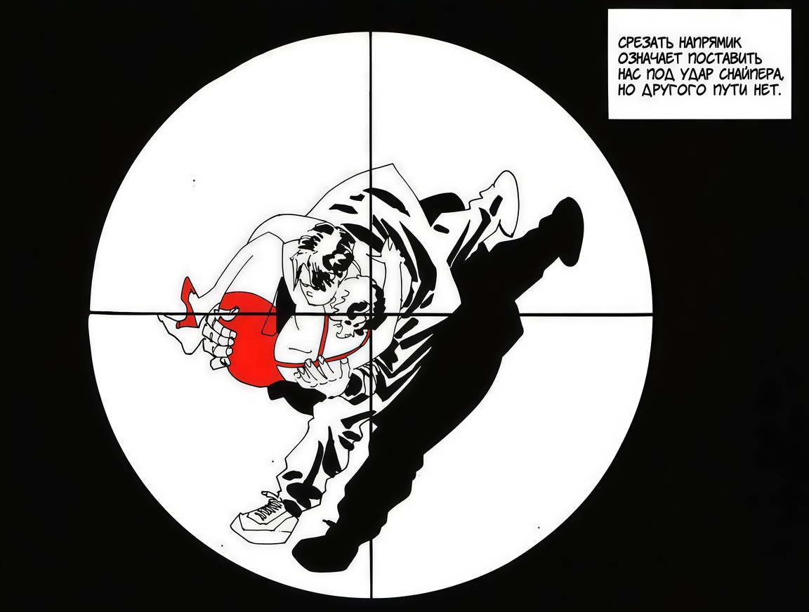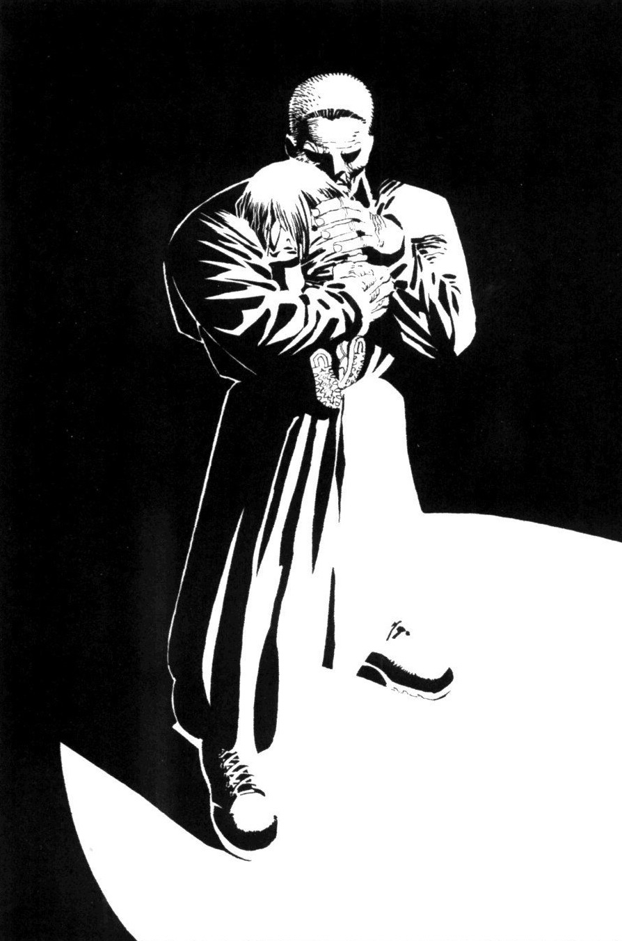 Чтобы сделать появление эпизода или персонажа внезапным, Франк Миллер создает инверсию, оставляя персонажа либо черным, либо белым.